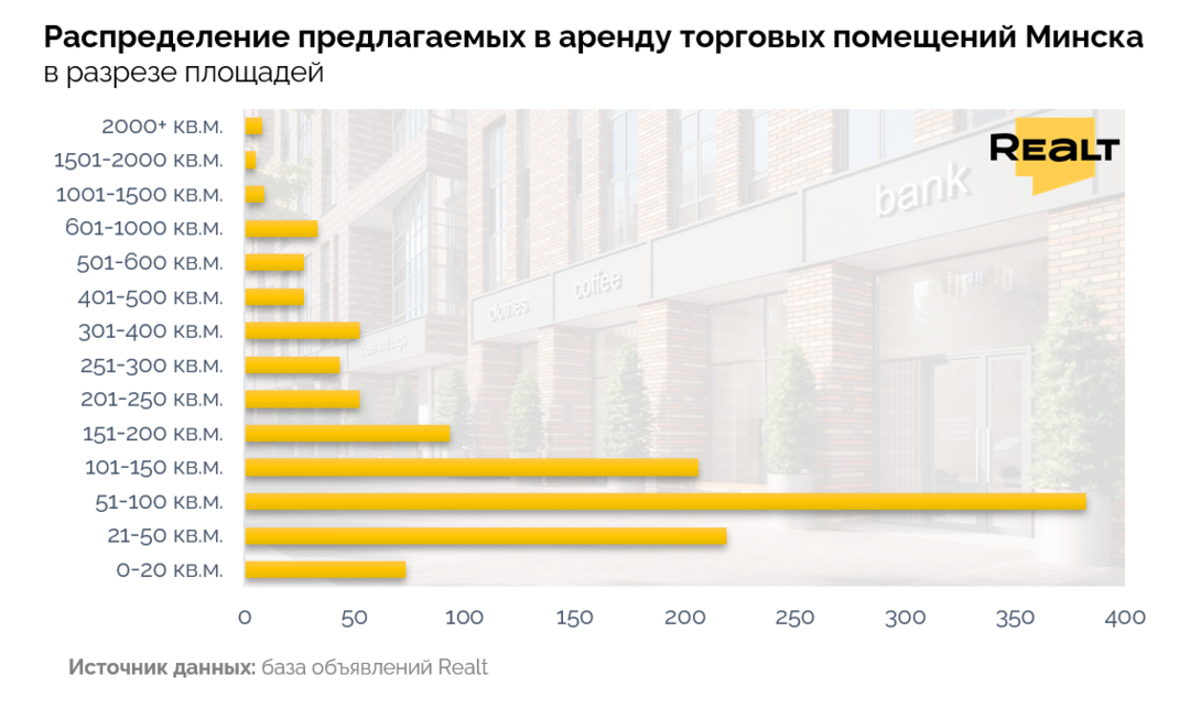 В объем объеме предложения в аренду коммерческих помещений, более 70% из них имеют площадь от 20 до 200 кв.м. — по причине их наибольшей востребованности арендаторами.