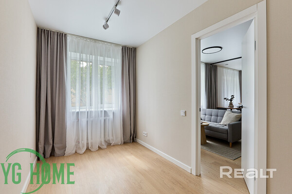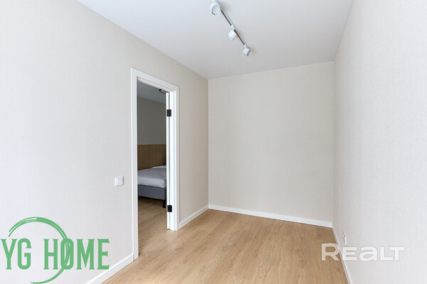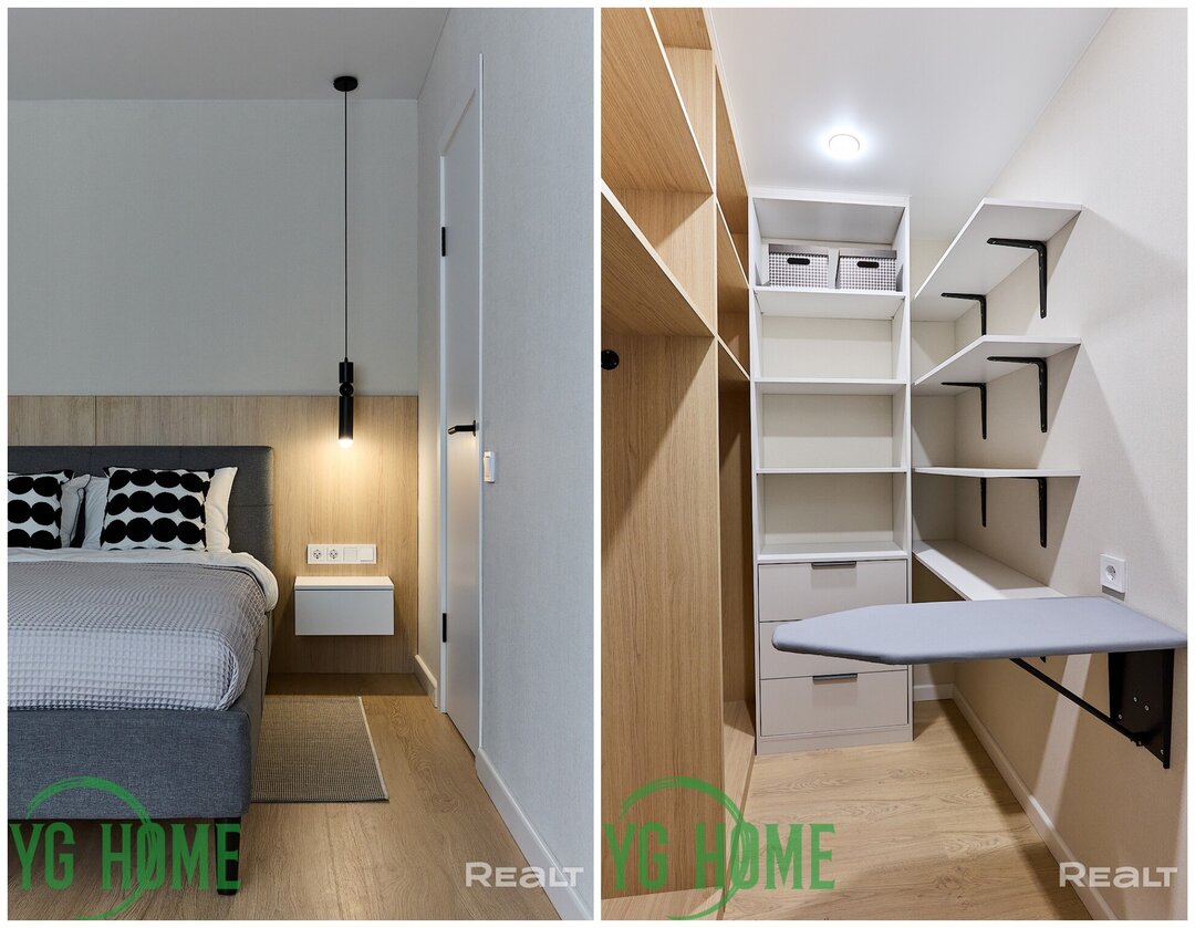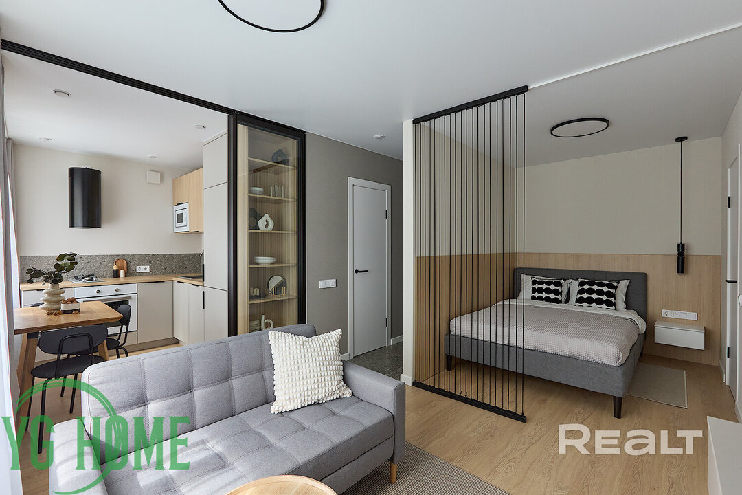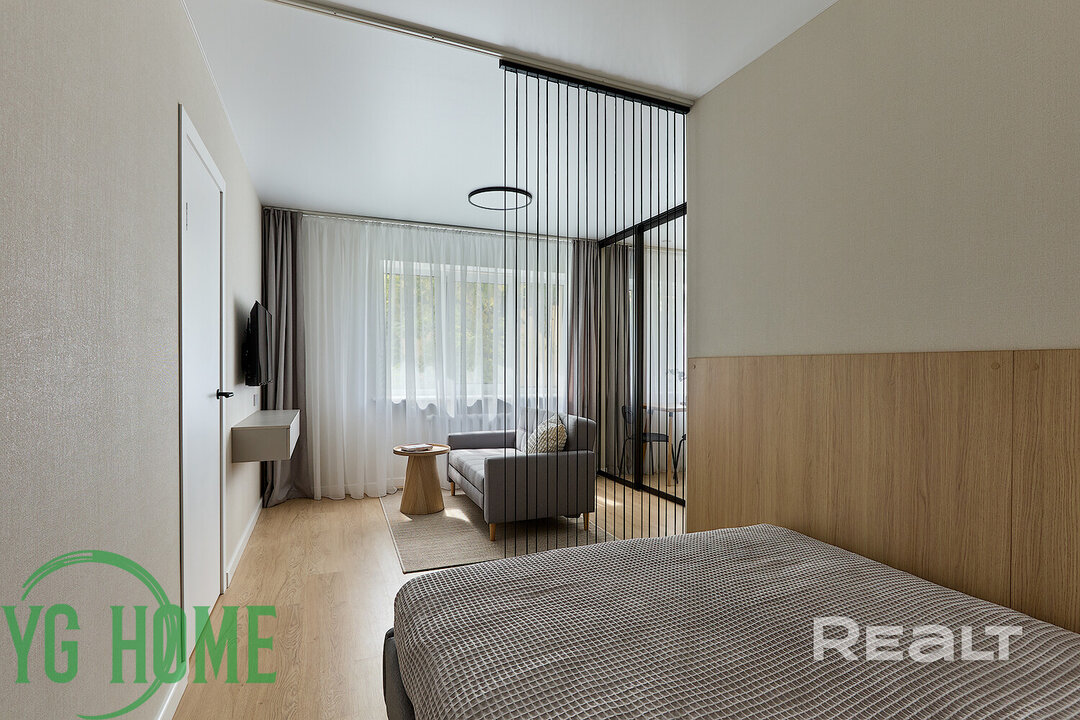 Жилая комната разделена на две части: гостиную и спальню. Около кровати есть дверь, за которой спрятана полноценная гардеробная. За второй дверью — изолированная комната.