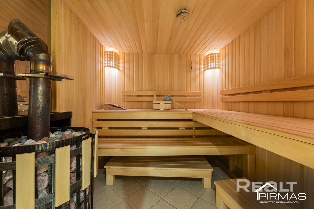 Но дом — это лишь половина всего объекта. На участке имеется банный комплекс на 100 квадратов с зоной отдыха вокруг него. Отдельное здание бани в едином стиле с домом включает просторную парную и комнату отдыха, крытую террасу с печью-барбекю.