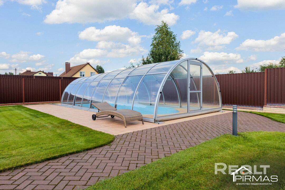 Рядом расположен уличный бассейн с системой подогрева, мощной фильтрацией и функцией противотока, позволяющей плавать, как в мини-бассейне. Над бассейном установлен раздвижной прозрачный купол — уникальная опция, которая даёт возможность в хорошую погоду купаться под открытым небом, а в непогоду надежно защищает водную гладь от листвы, ветра и дождя.