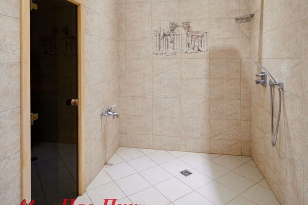 Но дом — это лишь половина всего объекта. На участке имеется банный комплекс на 100 квадратов с зоной отдыха вокруг него. Отдельное здание бани в едином стиле с домом включает просторную парную и комнату отдыха, крытую террасу с печью-барбекю.