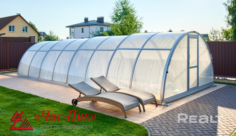 Рядом расположен уличный бассейн с системой подогрева, мощной фильтрацией и функцией противотока, позволяющей плавать, как в мини-бассейне. Над бассейном установлен раздвижной прозрачный купол — уникальная опция, которая даёт возможность в хорошую погоду купаться под открытым небом, а в непогоду надежно защищает водную гладь от листвы, ветра и дождя.