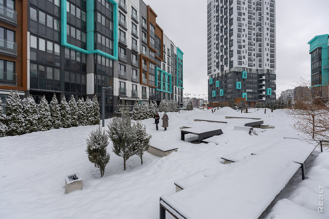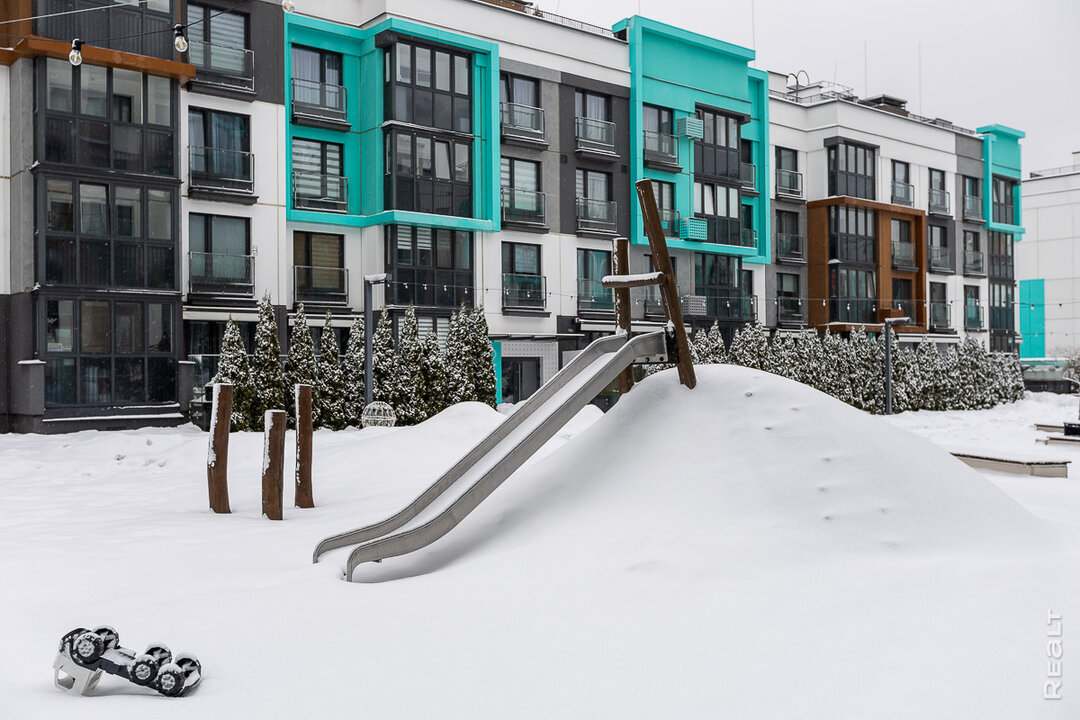 Мы выходим из подъезда во двор. Сейчас он засыпан снегом, но как только потеплеет, говорит Екатерина, тут всё зазеленеет. Помимо детской площадки, во дворе есть и зона с розетками для удаленной работы на природе.