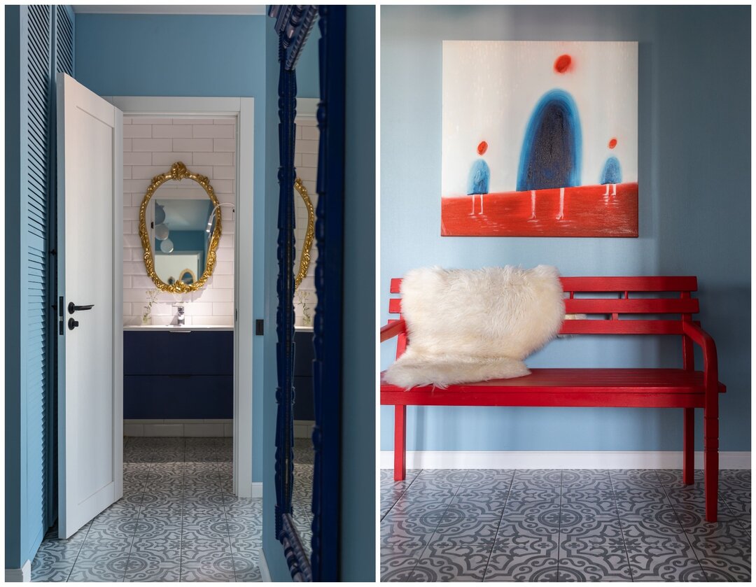 В каждом жилом пространстве есть свой основной цвет и множество акцентов, которые принесли в квартиру нотки эклектики: перекрашенные винтажные зеркала, приобретенные на барахолке, советские люстры и картины, нарисованные местной художницей. Сюжеты работ подбирали в интернете.