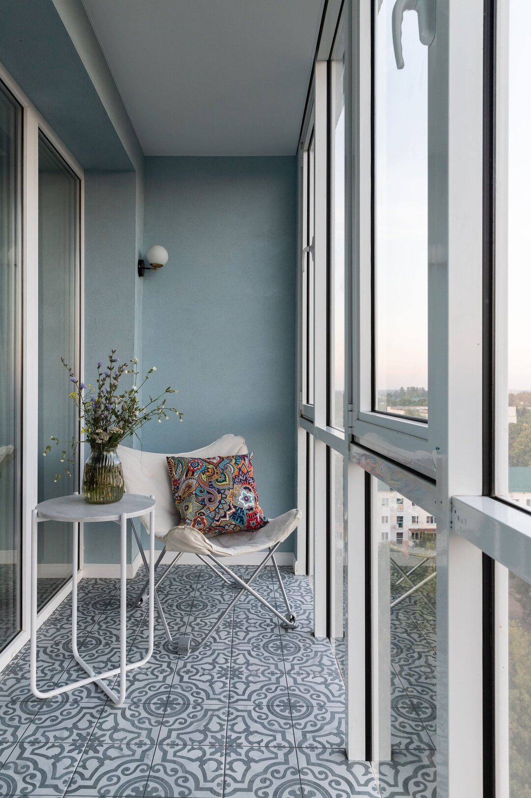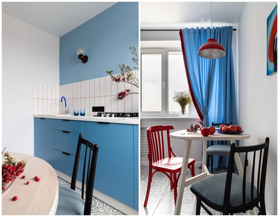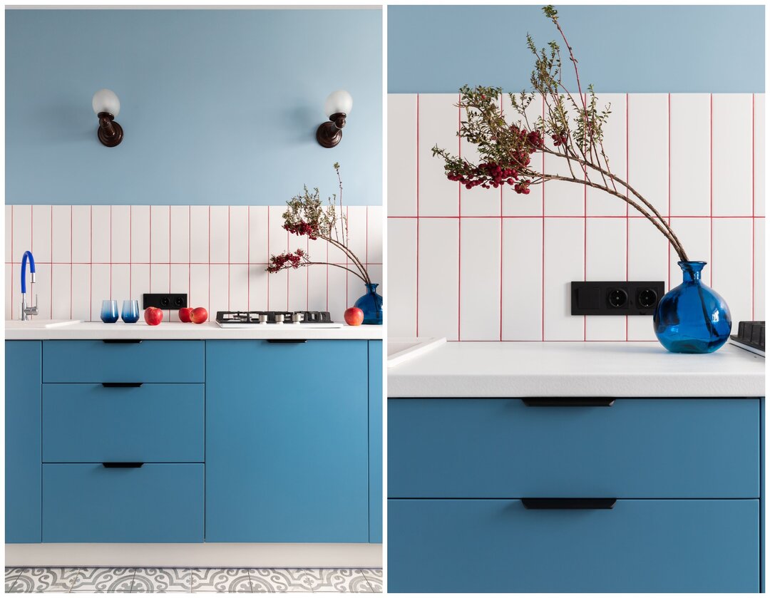 Особым местом притяжения стала кухня. Она небольшая, но красочная. Для ее оформления была выбрана смелая цветовая палитра — голубые фасады и яркие ягодные швы на фартуке. На полу лежит плитка с геометрическим рисунком, которая плавно переходит в коридор, ванную и туалет, создавая ощущение целостности пространства.