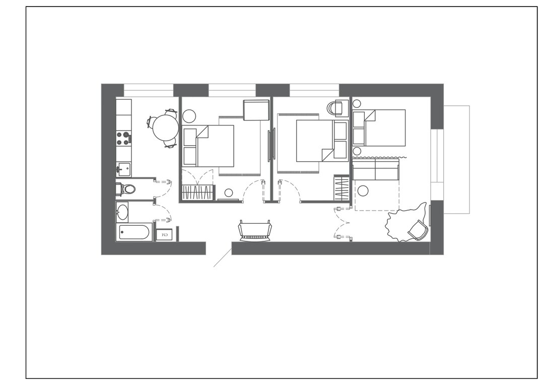 Заказчики сразу обозначали скромные рамки бюджета. Хотелось простых решений, которые можно реализовать своими силами. Поэтому сразу пришлось отказаться от идей с перепланировкой. На самом деле, изначальное расположение комнат достаточно хорошее: все они изолированные, окна выходят на парк и реку.