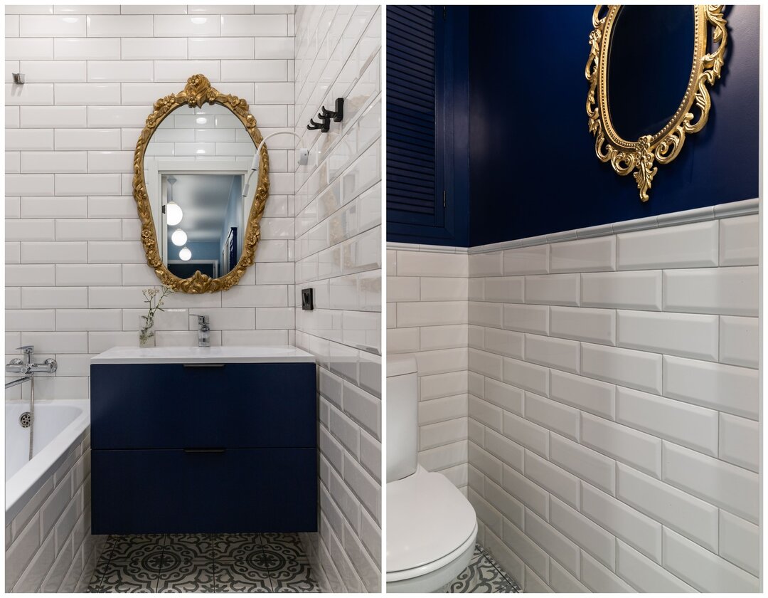 — Работая с подобными планировками в старом фонде, я всегда стремлюсь переделать ванную комнату, разместив раковину с зеркалом напротив входа. Тогда получается эстетичный вид с открытой дверью. Единственный вопрос в этом случае: куда поставить стиральную машину? В этом проекте мы выделили хозяйственный шкаф рядом с ванной комнатой. Сверху удалось повесить и бойлер.