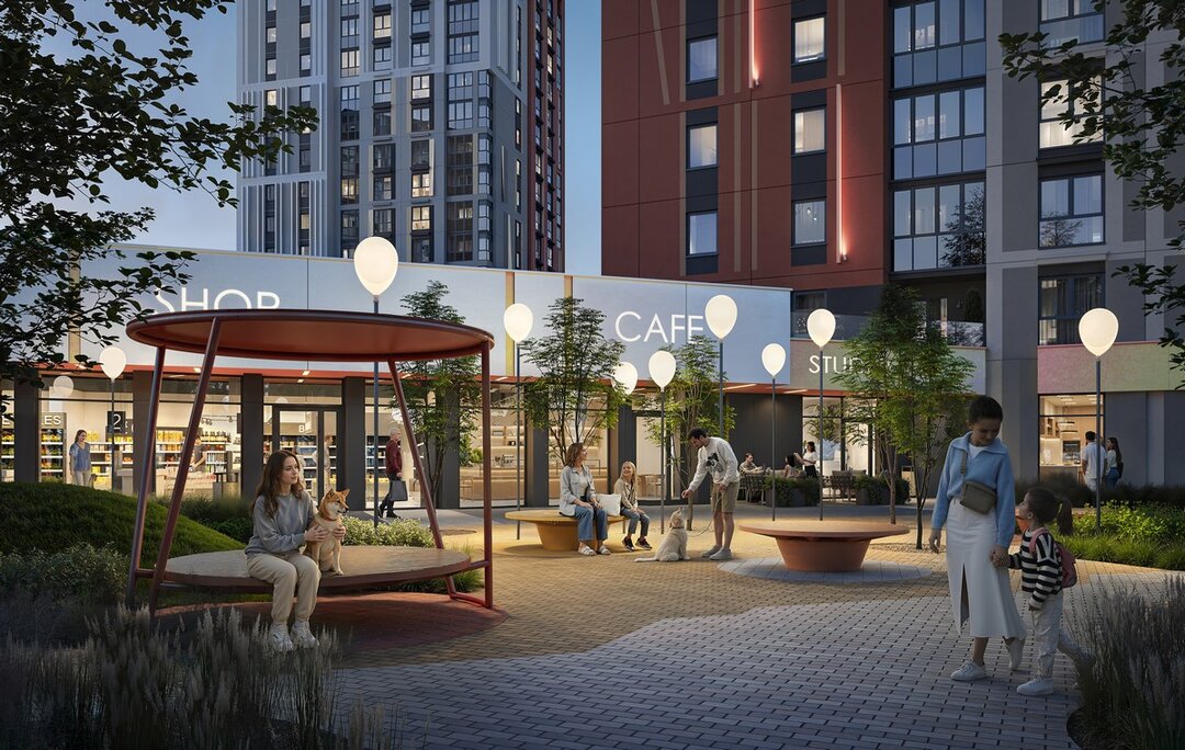 В общественной зоне у соседнего дома разместятся островки для отдыха и зеленые зоны. Нашлось место и для интерпретации известного мультфильма «Вверх»: возле дома установят уникальные светильники в виде воздушных шариков.