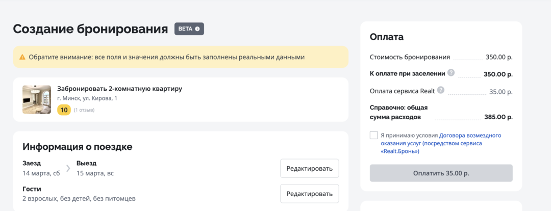 Дальше нажимаем кнопку «забронировать» и оплачиваем услуги сервиса — 10% от стоимости аренды. После оплаты сервиса свяжется хозяин, с которым можно будет обсудить детали заселения. Никаких подводных камней и изменений условий.