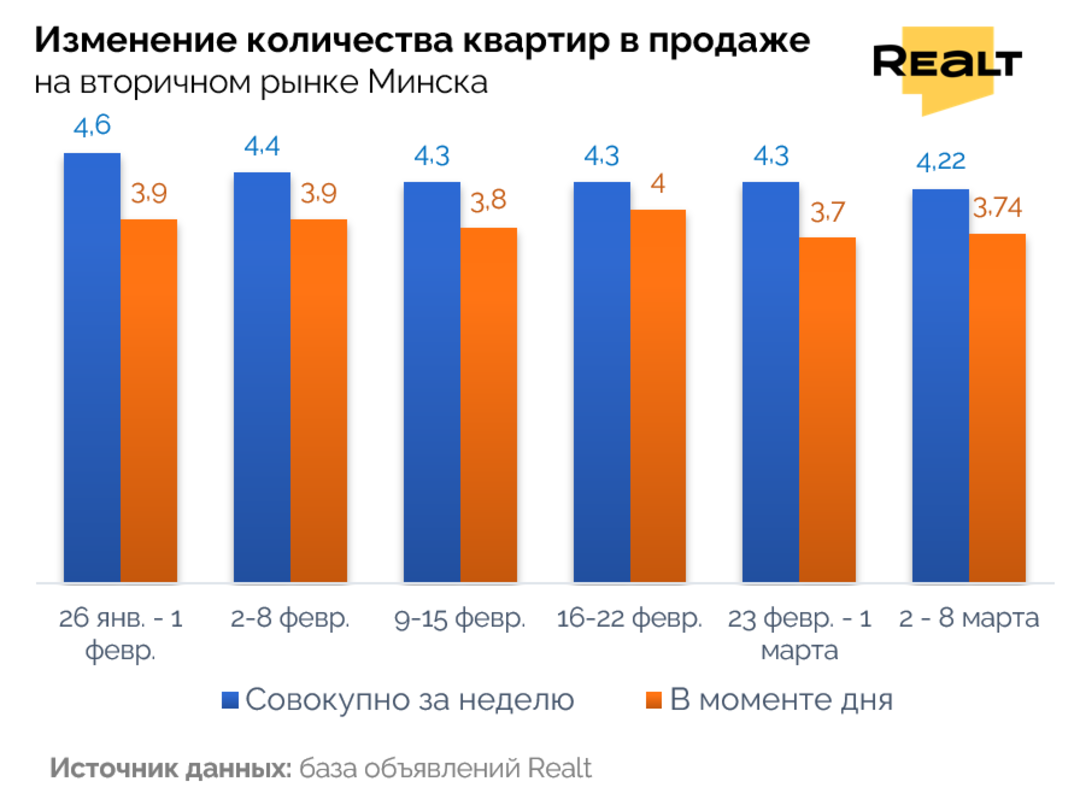 Совокупное количество квартир, которое было доступно в течение прошлой недели для выбора покупателям на вторичном рынке жилья в базе Realt уменьшилось на 2% до 4,22 тыс. объектов.