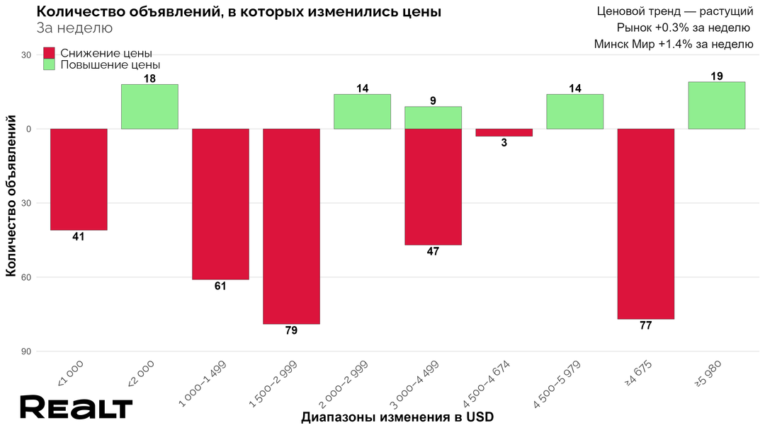А теперь в деталях: за прошлую неделю подешевело 8% квартир от общего объема предложения (327 квартир, в среднем на 1000−5000 долларов), а доля случаев увеличения цены всего 2% — стали дороже 104 квартиры в среднем на 2000−6000 долларов.