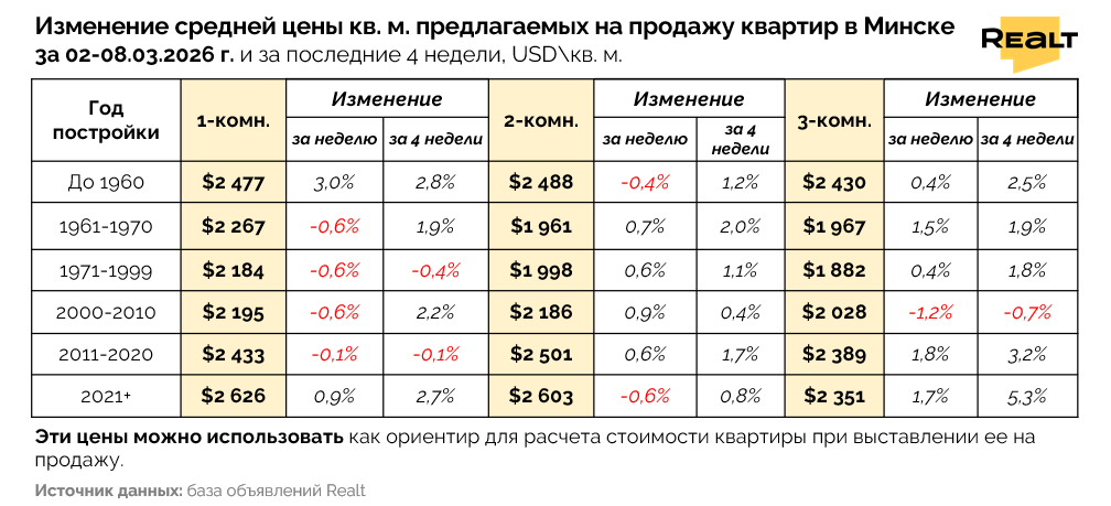 Как видно из таблицы ниже, в целом по Минску, минус в ценах за последнюю неделю отмечается только по 1-комнатным квартирам, но при этом в широком возрастном диапазоне — от хрущевок до домов 2000-х годов постройки. А по панельным домам родом из СССР появился минус даже в горизонте последних четырех недель.
