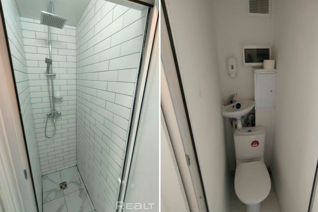 Помещение находится на первом этаже. Вход — из подъезда. Общая площадь — 11,8 квадрата. Здесь установлена небольшая кухня и стоит диван. В кухне есть портативная электроплита. Подключена стиральная машина. Организован раздельный санузел. Установлена душевая и унитаз. На полу везде лежит плитка. Заведено оптоволокно.