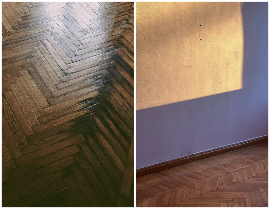 — Конечно, мне хотелось сохранить все. Было чувство, будто снимая обои, я выпускаю воздух, которым дышали классики. Я представляла, как буду ходить по паркету, по которому ходили они, — делится девушка. — За него мы боролись до последнего. Долгое время сверху лежал ламинат, который серьезно повлиял на состояние дерева. Поэтому мы просто купили такой же паркет и положили его в комнатах точь-в-точь как было. А вот для коридора и кухни выбрали плитку.