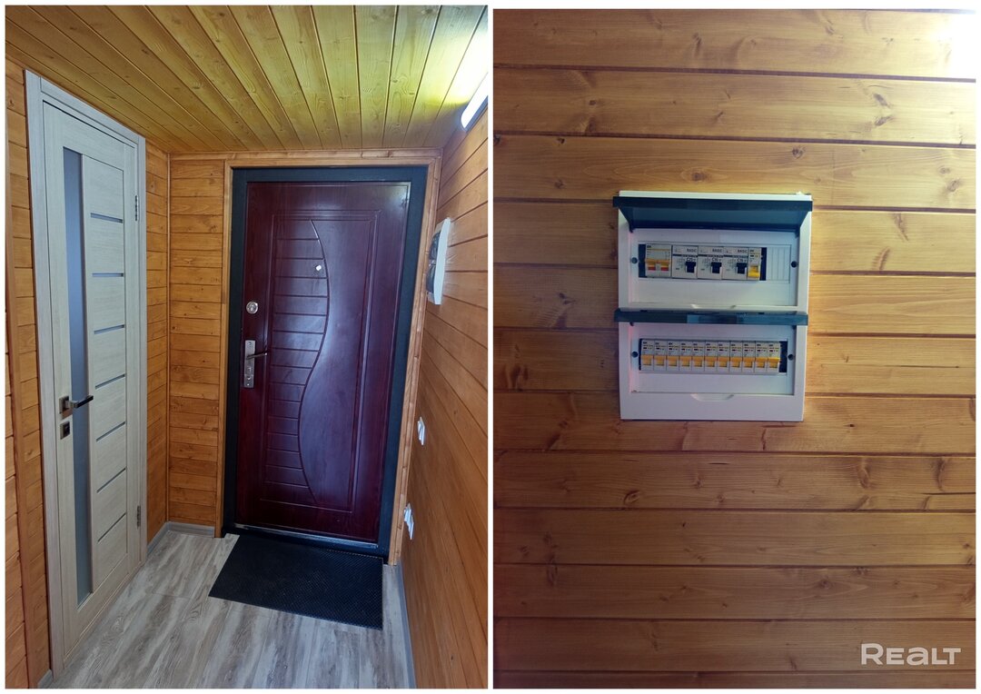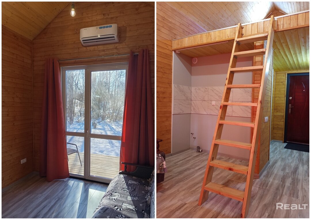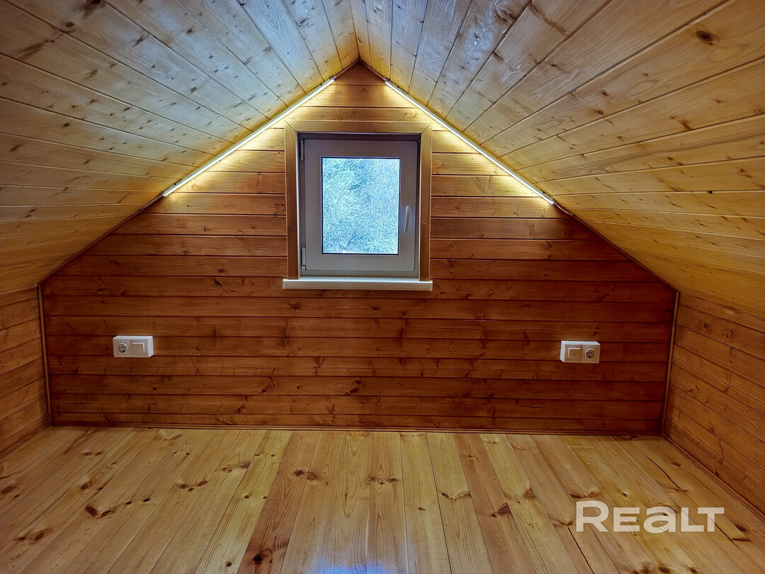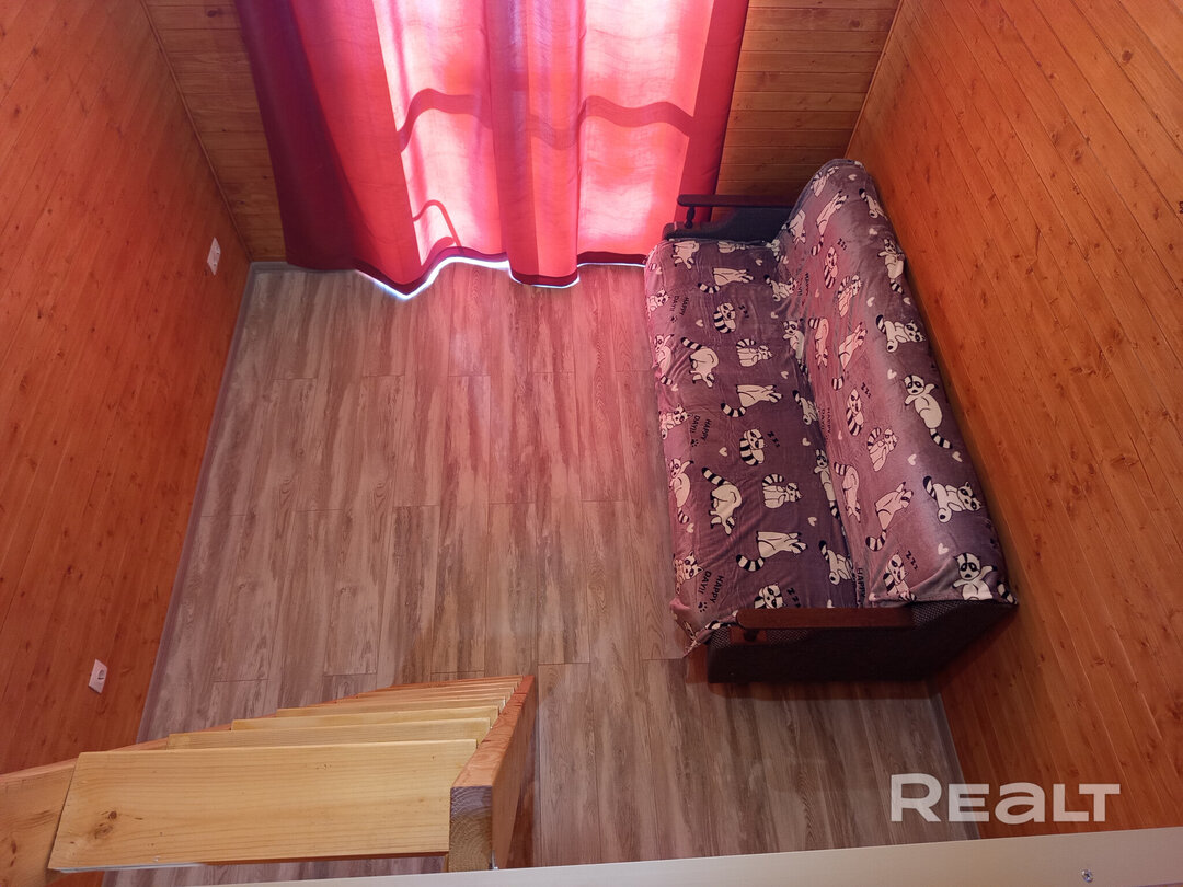 Дача состоит из двух уровней. На первом расположилась кухня-гостиная, а на втором (открытом чердаке) можно организовать спальное место. Внутренняя отделка дома — дерево. На полу — ламинат. На фотографиях можно заметить панорамные окна, диван, шторы и розетки. Кухонного оборудования в помещении нет, но местечко под кухню с «фартуком» и со всеми выводами уже подготовлено.