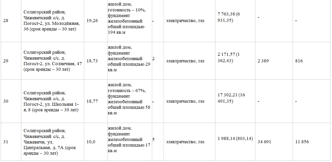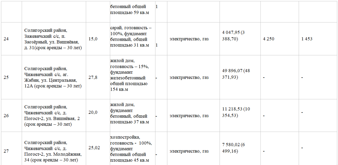 В Солигорском районе на аукцион в аренду на 30 лет предлагались 8 участков с недостроенными строениями. На один в деревне Чижевичи на улице Центральной, 7 А, Чижевичского сельсовете подали 5 заявлений. Железобетонный фундамент насчитывает 17 квадратных метров. Из коммуникаций имеются электричество и газ. Стартовая цена на лот составила 1 988 рублей, в том числе дома — 803,14 рубля. Лот удалось продать за 34 691 рубль, или 11 856 долларов.