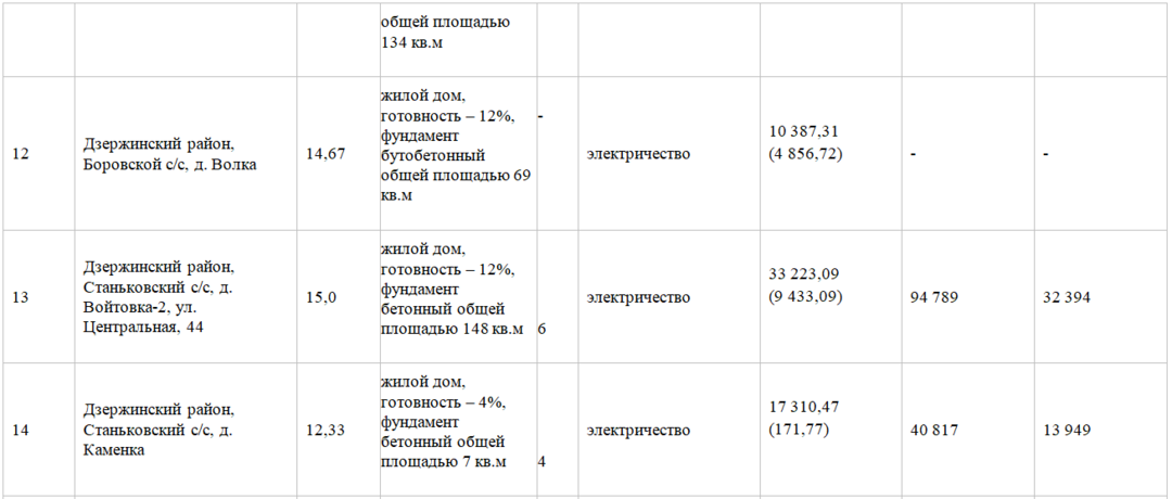 В Дзержинском районе на аукцион выставляли 4 участка с не завершенными строительством домами. Торги прошли по 2 лотам. Семь заявлений подали на лот № 13, но один человек не прошел регистрацию. Дом расположен в деревне Войтовка-2 на улице Центральной, 44, Станьковского сельсовета. Площадь участка насчитывает 15 соток. Готовность строения составляет 12%. Общая площадь бетонного фундамента насчитывает 148 квадратных метров. Есть возможность подвести к дому электричество. Начальная цена на лот составила 33 223 рубля, в том числе дома — 9 433 рубля. Его продали за 94 789 рублей, или 32 394 доллара.