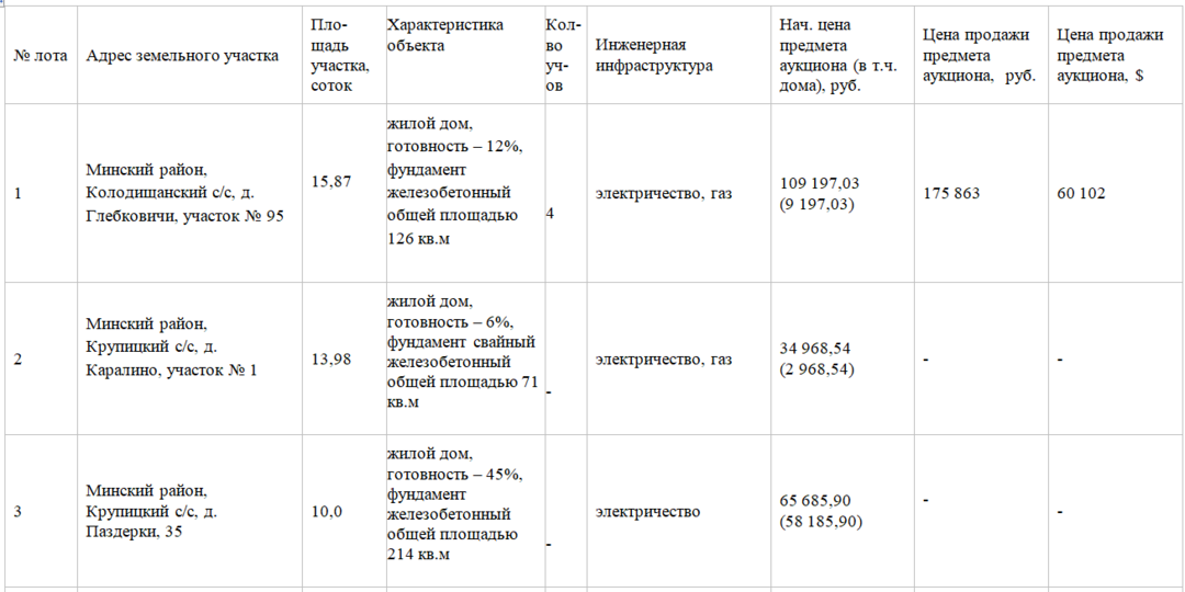 2053Сегодня состоялся аукцион по продаже не завершенных строительством незаконсервированных жилых домов в Минском, Березинском, Дзержинском, Логойском, Слуцком, Смолевичском и Солигорском районах Минской области. Рассказываем об итогах торгов.