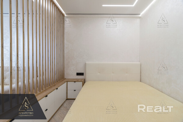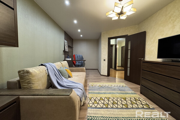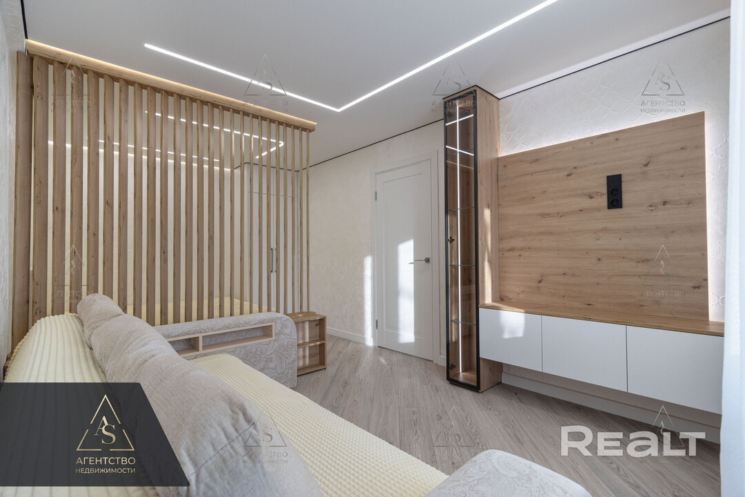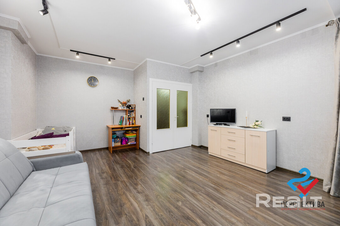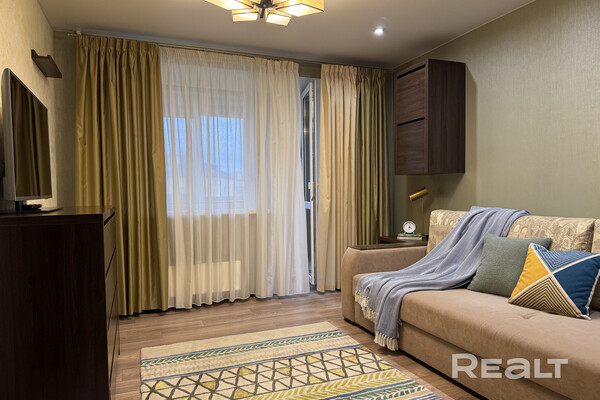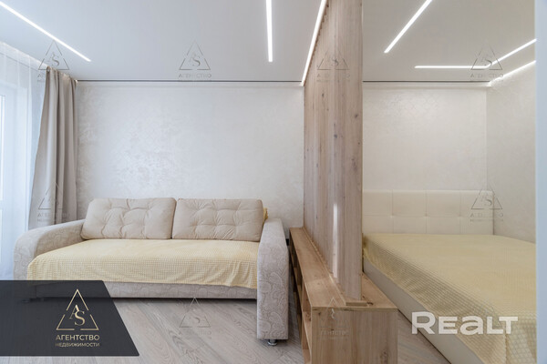 Жилая комната разделена на две зоны — спальню и гостиную. На стенах — декоративная штукатурка, потолки натяжные. Есть выход на застекленную лоджию с теплыми полами и утеплением.