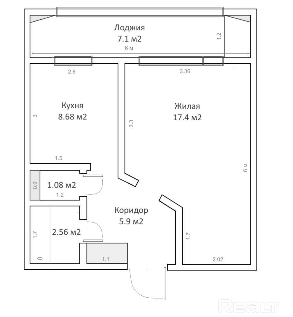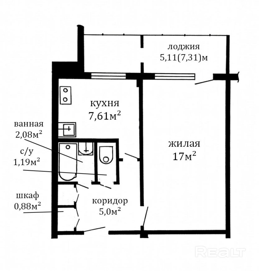 В жилой комнате стоит диван и телевизор, есть рабочее место. Есть выход на застекленную лоджию. Кухня выполнена в светлых тонах. В прихожей есть встроенный шкаф. Санузел раздельный. Установлена ванна.