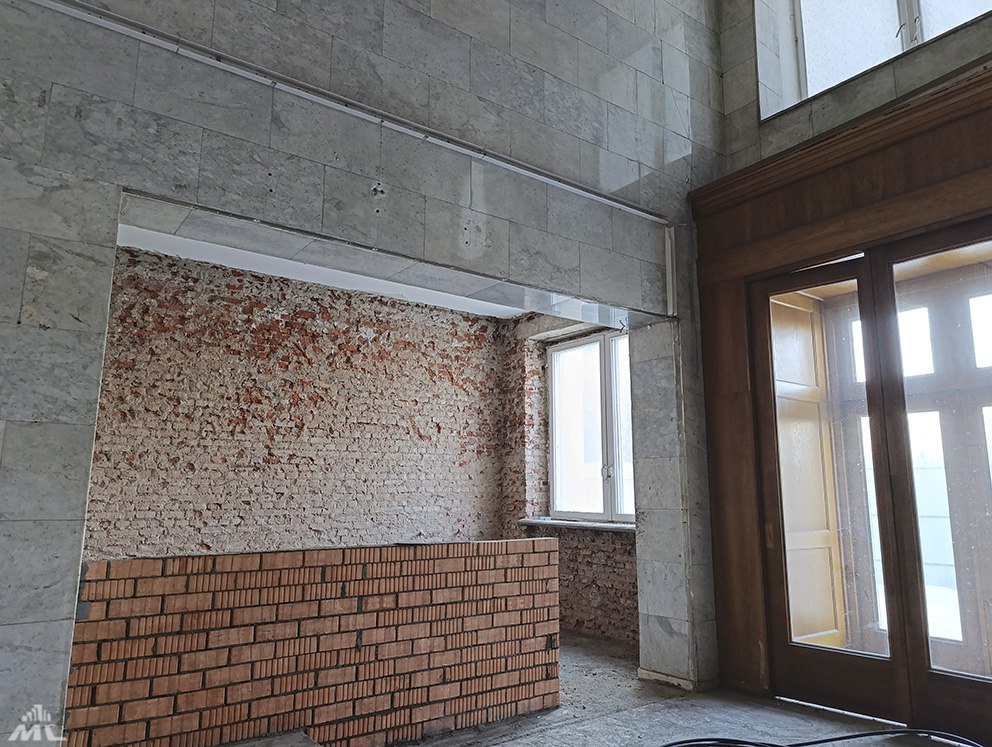 Главный корпус БГУ закрыт на реконструкцию. Внутри строители ведут демонтажные работы. В блоке А, что параллельно проспекту, строители разобрали перегородки и зашивки, демонтировали старые коммуникации, потолки и бетонные полы, сбили штукатурку со стен. Проводят усиление конструкций и выкладывают новые перегородки. Кирпичные стены укрепят методом торкретирования.