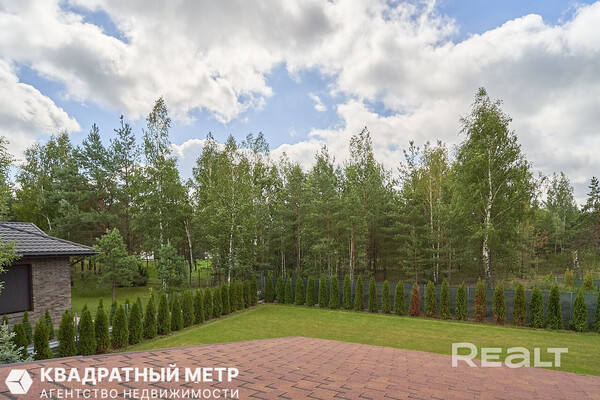Площадь участка — 14 соток. Он огорожен, часть выложена плиткой, созданной по спецзаказу. На другой части высажен газон и декоративные туи. Есть гараж на две машины и паркинг, где поместится еще пять автомобилей. Кроме этого, есть навес, площадка под теннисный корт или мини‑футбольное поле.