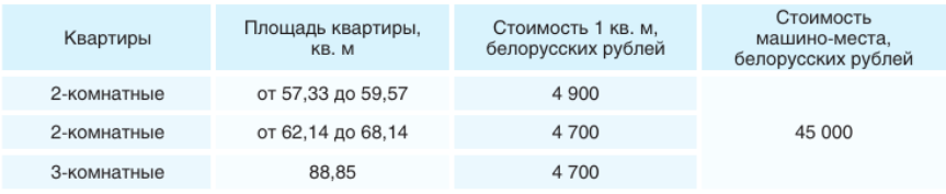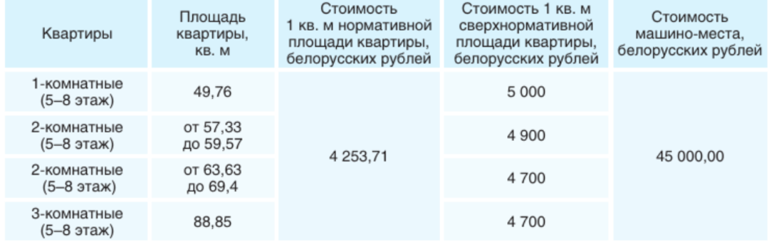Стоимость квадрата для граждан, состоящих на учете нуждающихся в улучшении жилищных условий, составляет 4253 рубля (около 1450 долларов). Это касается нормированной площади — 15 квадратных метров на человека (при строительстве для одного человека однокомнатной квартиры − 30 квадратов). Метры сверх нормы нужно оплачивать по другим ценам — от 4700 до 5000 рублей (1600−1700 долларов). Отметим, что все квартиры требуют покупки обязательного паркинга за 45 тысяч рублей (15 тысяч долларов).