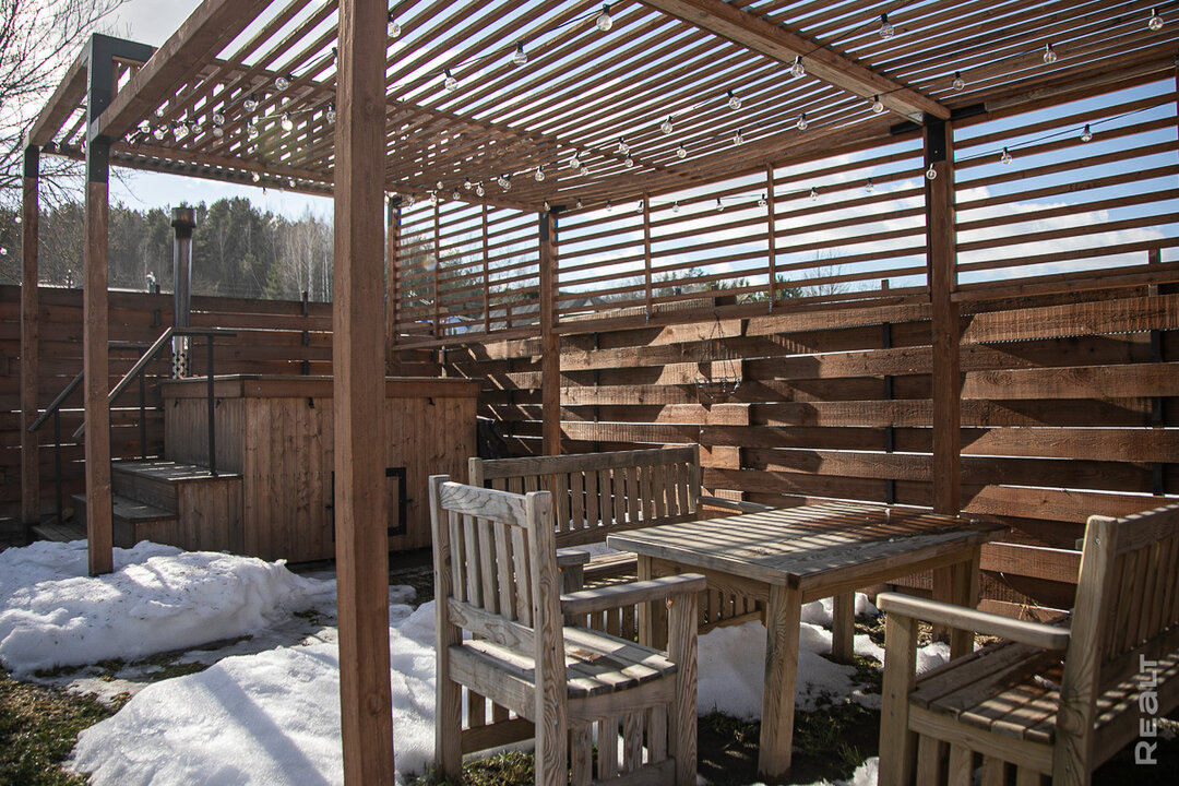 Когда была готова ландшафтная часть и установлена купель под изящной перголой, хозяева стали приглашать гостей в первый домик. Второй с виду полностью готов, но еще не сдается — там остались последние штрихи по отделке.