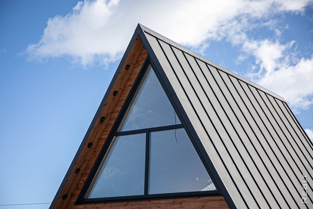 Внимательный человек заметит, что в отличие от классических А-фреймов, у этих есть боковые вертикальные стены. Они совсем невысокие, но это в значительной мере облегчило обустройство внутреннего пространства — можно размещать мебель и сантехнику вплотную к стенам (в классических домах-треугольниках диван или унитаз под скатом не установишь). То есть главная цель таких изменений в конструкцию А-фрейма — возможность использовать пространство более рационально.