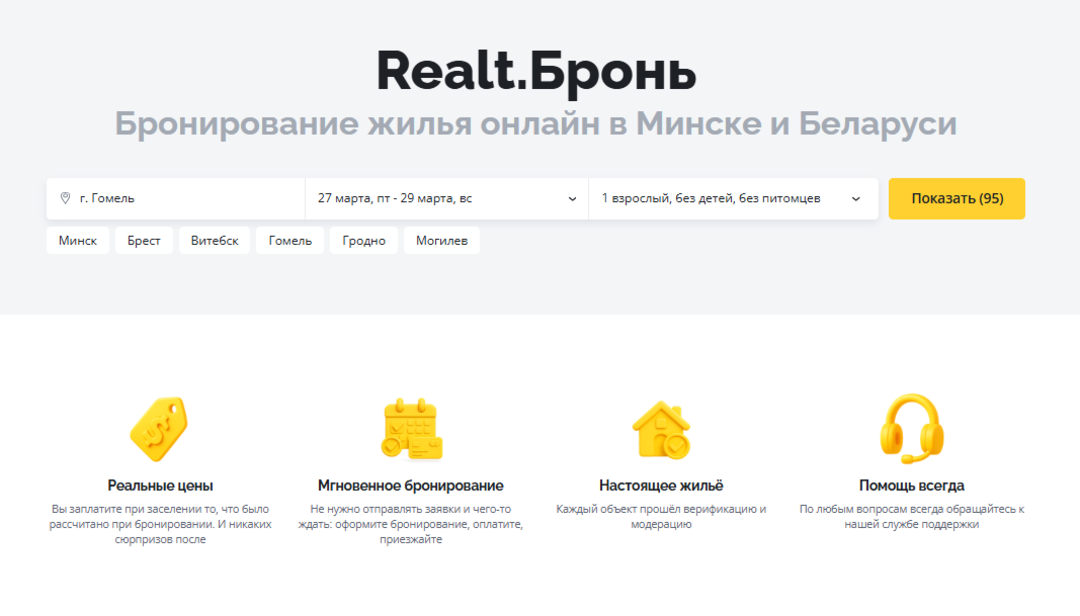Забронировать жилье онлайн очень легко. Заходите на Realt.Бронь, выбираете нужные даты, вводите число гостей и смотрите варианты квартир. Когда найдёте ту, что понравится, жмете «Забронировать». Далее в течение 30 минут надо внести оплату сервиса (10 % от стоимости жилья) — и квартира ваша. Именно в этом месте и по этой цене. И никаких звонков, переговоров или изменений цены!
