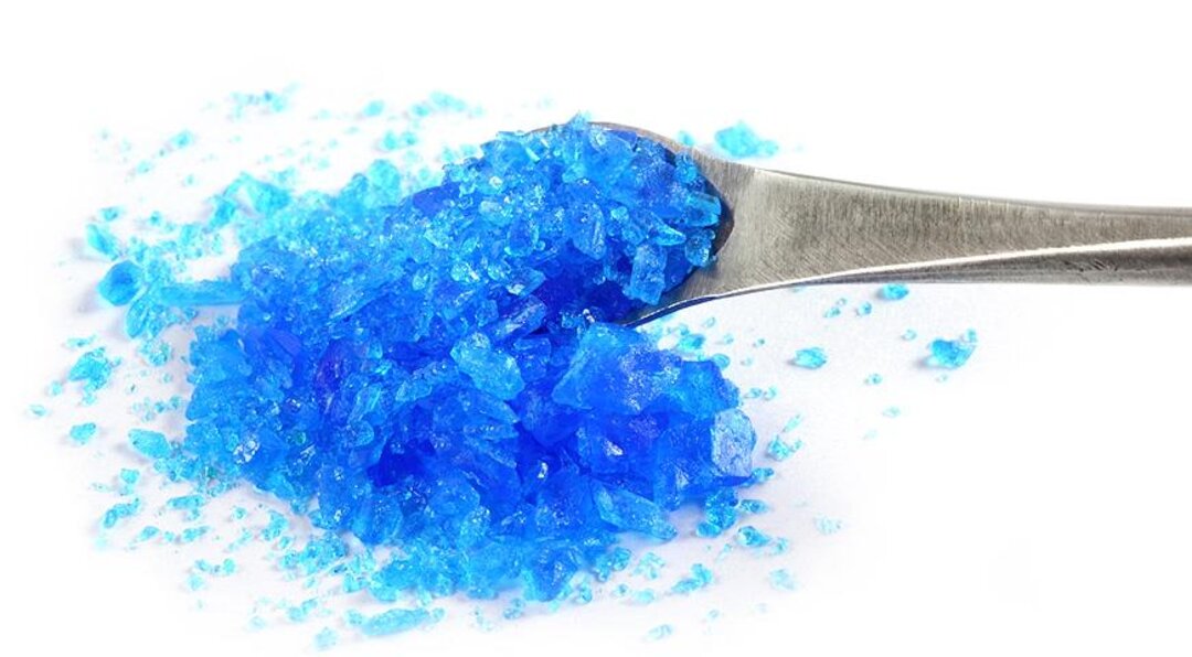 Растворяем медный купорос. Отмерьте 100 г медного купороса (это примерно половина стандартного стакана, но лучше использовать весы). Насыпьте порошок в одну из емкостей и залейте 1−2 литрами горячей воды (температура около 40−50°C). Хорошо перемешайте, чтобы кристаллы полностью растворились. Затем долейте холодной воды, доведя общий объем до 5 литров.