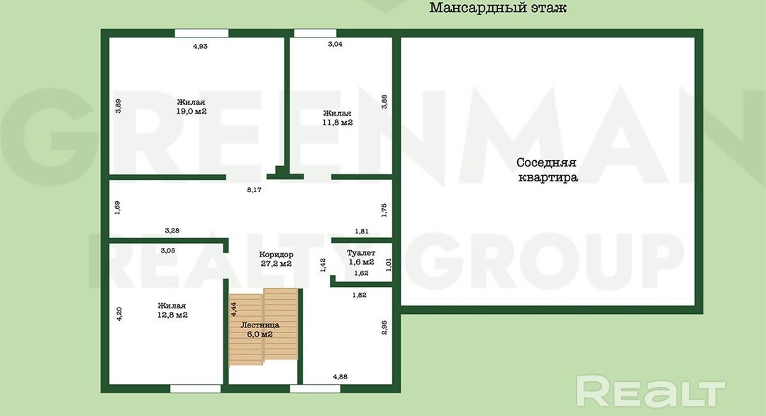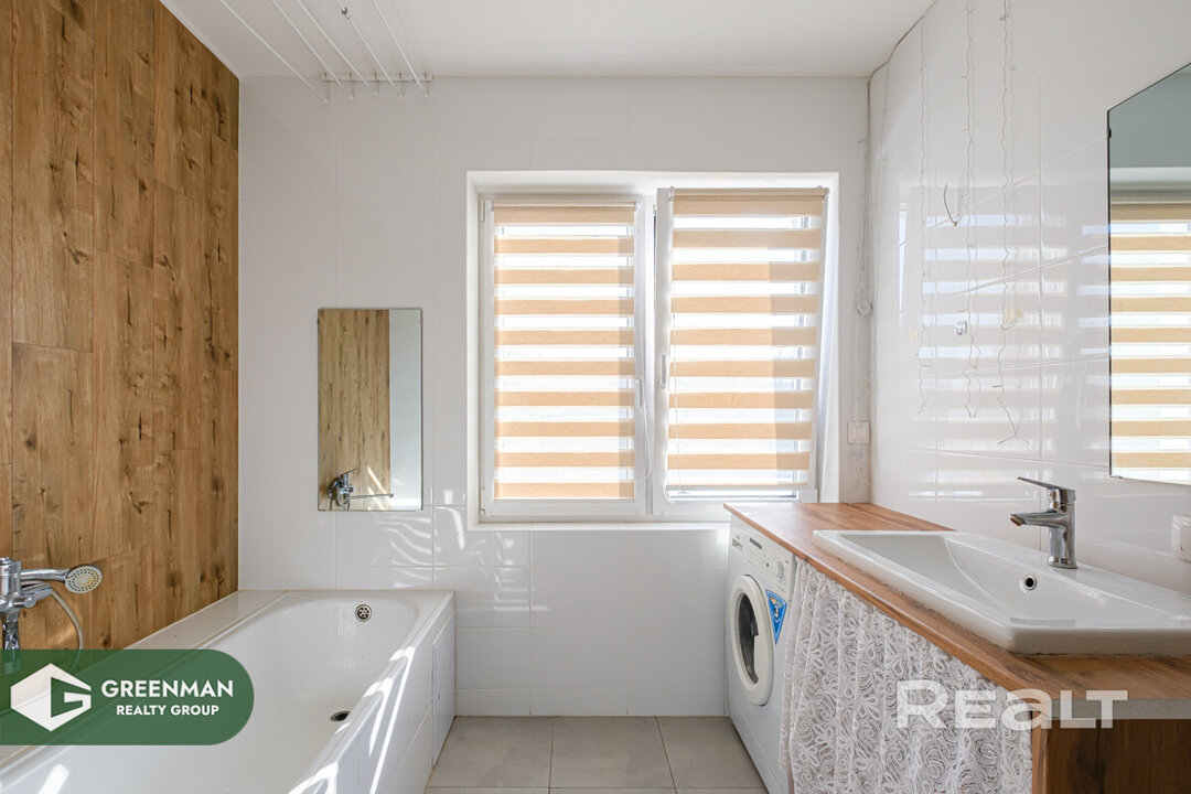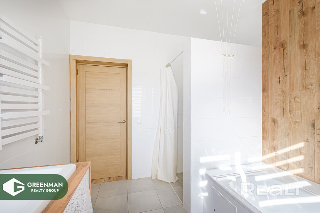 Квартира двухэтажная, общая площадь — 156,7 м2. На первом этаже расположены прихожая, кухня, гостиная, спальня с гардеробной, раздельный санузел, топочная. Полностью готов к проживанию, есть вся необходимая мебель. На кухне индукционная плита, духовка, холодильник, стиральная машина, телевизор.