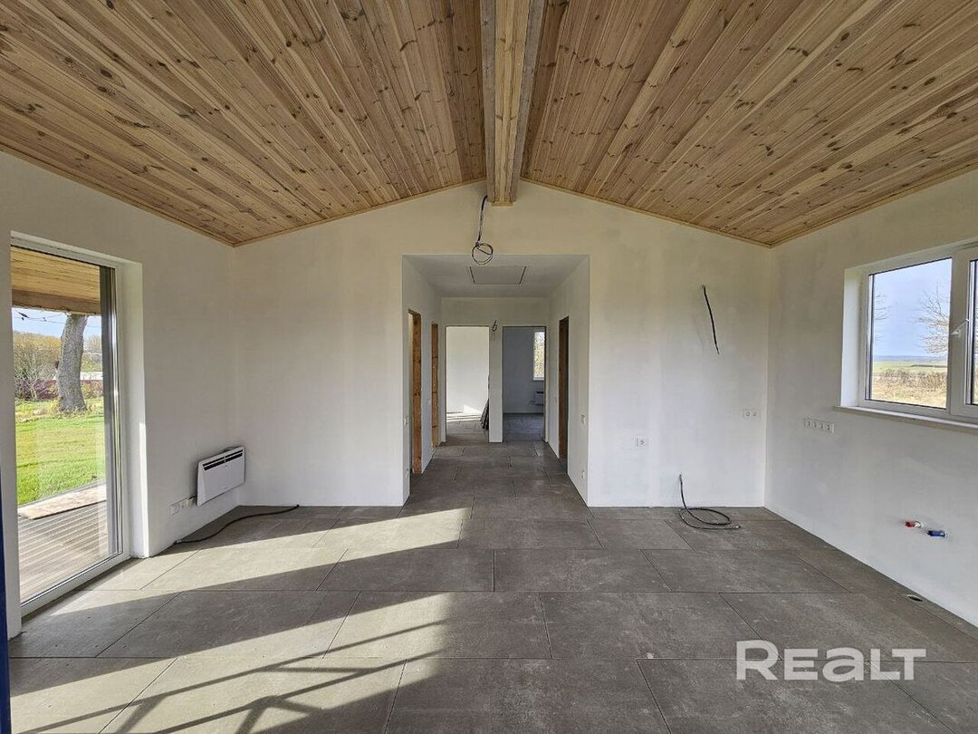 Это новый барнхаус для круглогодичного проживания или сдачи в аренду. К нему примыкает широкая Г-образная терраса. Дом каркасный, 2026 года постройки, введен в эксплуатацию. Фундамент под ним свайный, на крыше металлочерепица, деревянный каркас техсушки с двойным контуром утепления, панорамные окна Rehau с двойным стеклопакетом и энергосберегающим покрытием.