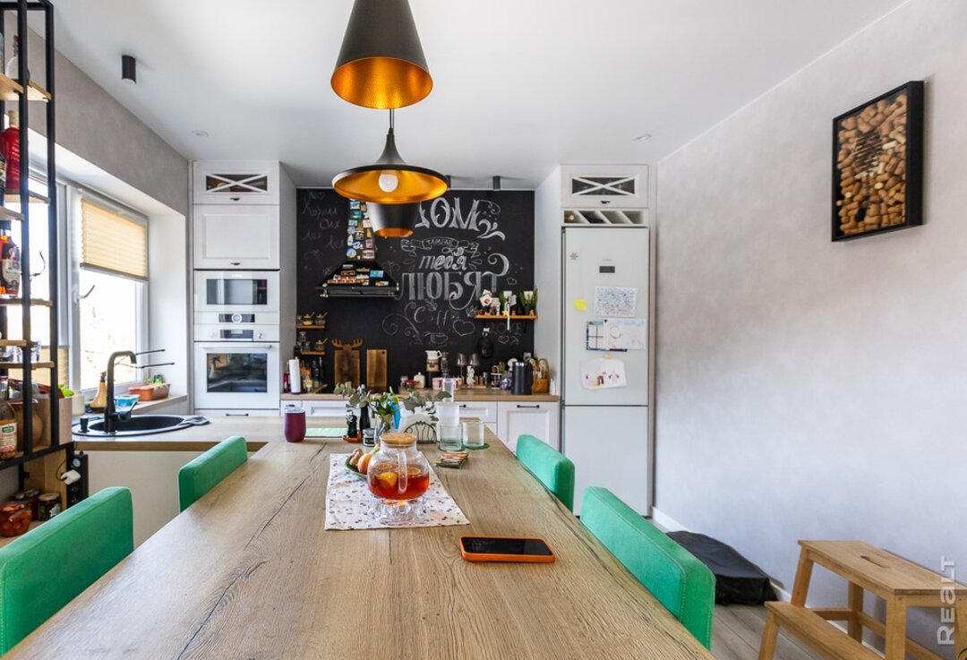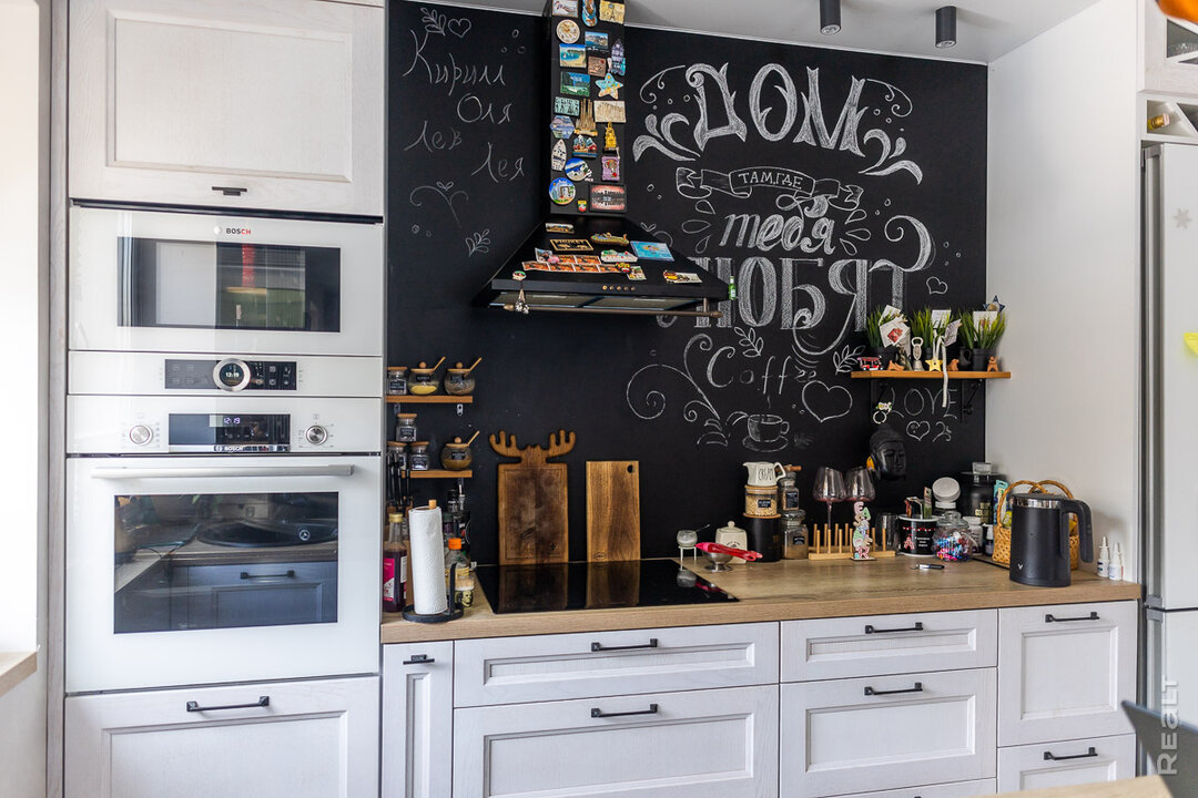 В центре кухни у семьи расположена графитная доска, где мелом написаны вдохновляющие слова. «Доску эту я сама разрисовывала. Идея появилась сразу же. Мне нравится заниматься литтерингом. Кстати, нарисовано это все было в первый год, и за столько времени все надписи сохранились. Местами только видно, что потертости есть там, где пыль протирается», — замечает Ольга.