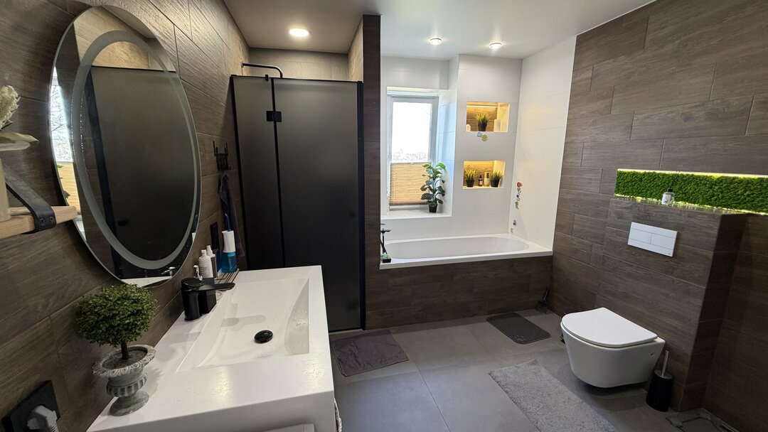 В доме изначально были сделаны все коммуникации. Вода, газ и электричество — все центральное, только канализация — местная. Новые владельцы только полностью меняли старые трубы на новые. Огромный плюс, как они отмечают, — прямо напротив дома лес.