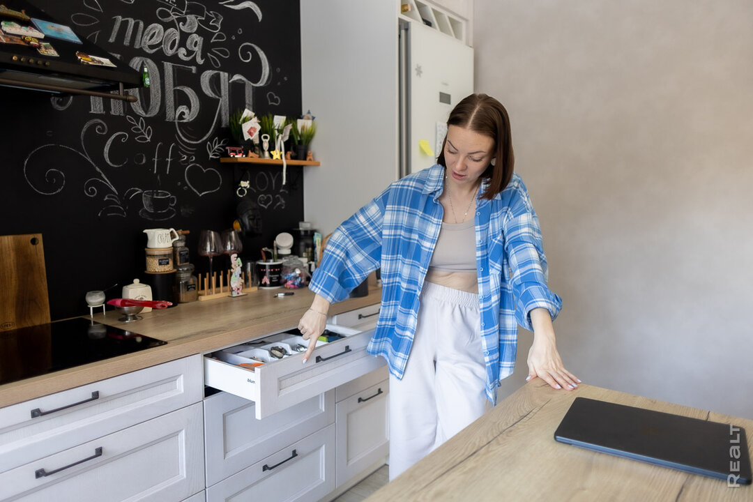 — Изначально фасады на полках были сплошными. Я после выписки из роддома увидела, что они совсем не смотрятся, и попросила сделать в одном стиле с карго, с выемками. Мы прям ругались с работниками салона, потому что они убеждали, что мой вариант будет выглядеть плохо. А после того, как сделали, признали, что так действительно намного лучше, и уже после нас начали делать своим клиентам кухни по нашему эскизу. Также с кухней была история, что возле раковины нашла скол. А так нельзя, потому что это дерево. Если попадет вода, оно может вздуться. Тоже переделывали, — делится воспоминаниями Ольга.