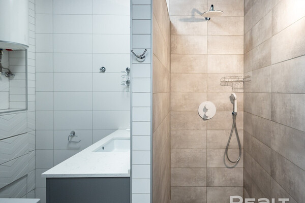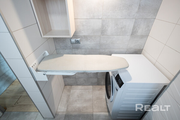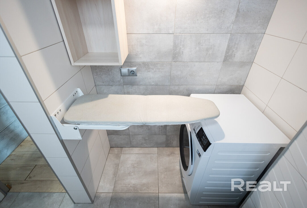 Санузел в евродвушке тоже совмещенный. Стены отделаны керамогранитом, установлена импортная сантехника. Тут сделан душ, нашлось место стиральной машине. Здесь же смонтирована гладильная доска.