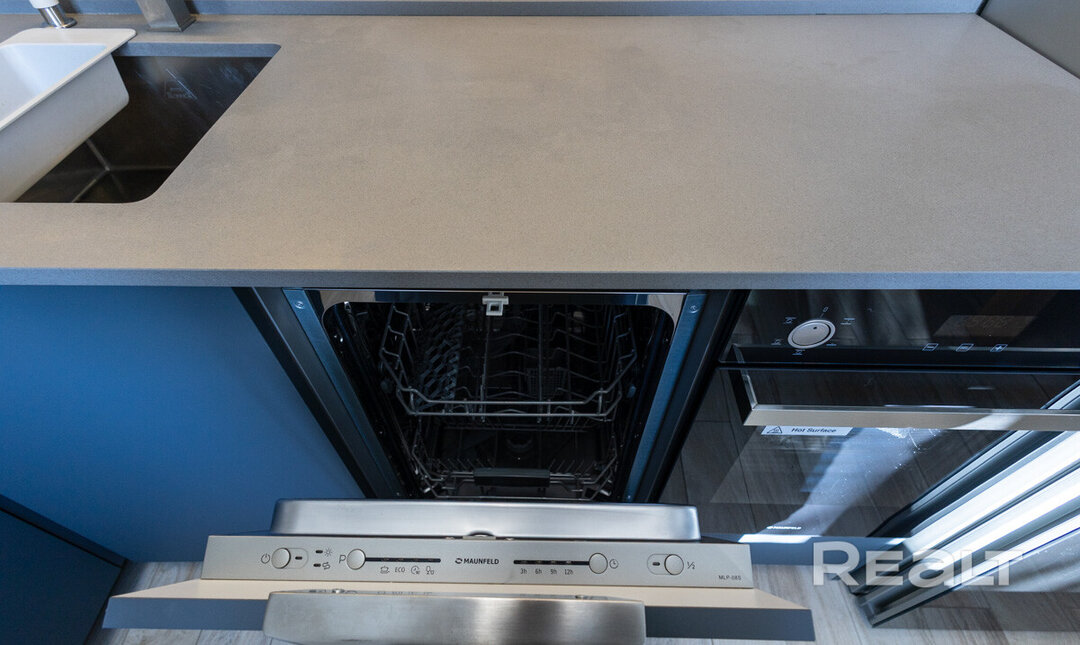В двушке есть холодильник, посудомоечная машина, духовой шкаф, газовая панель и кондиционер.
