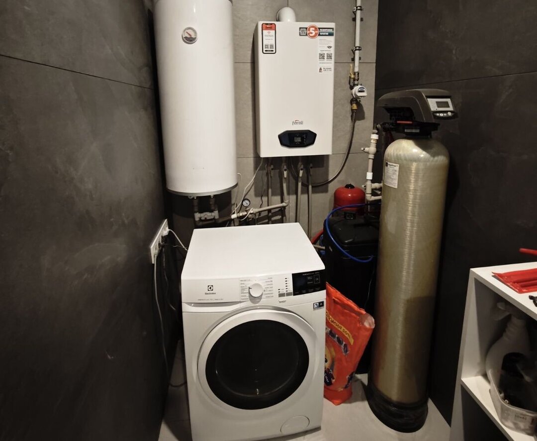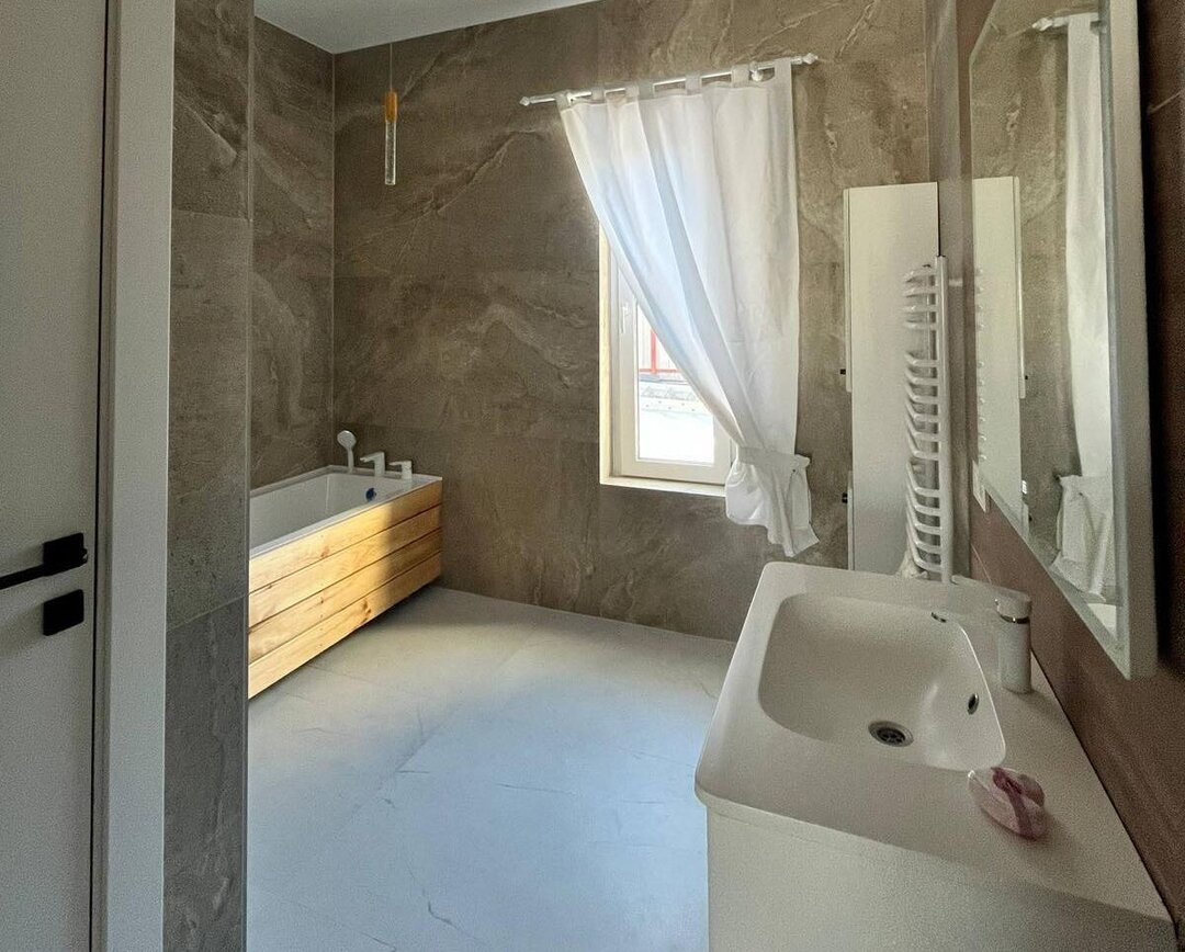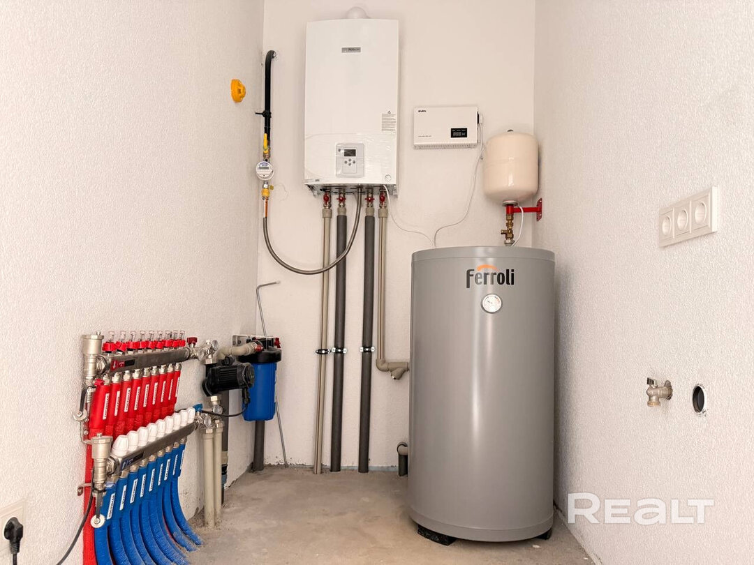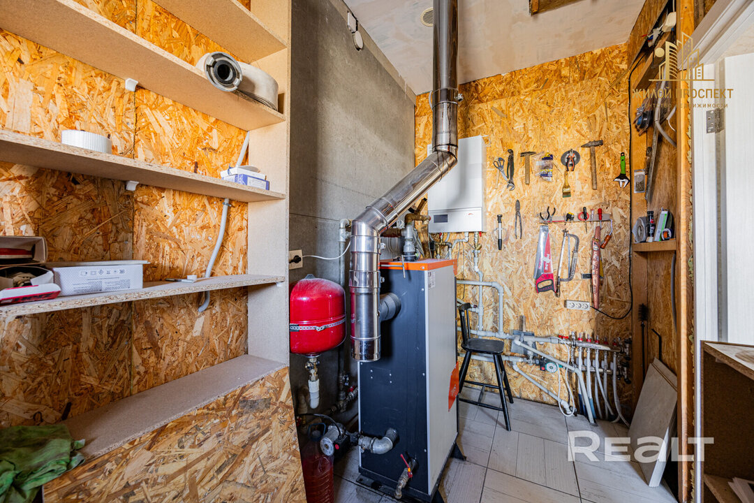 Дом стоит на утепленном фундаменте, стены из блоков, утепление 100 мм. На крыше – металлочерепица, бесшовная ливневая система. Перекрытие утеплено минеральной ватой 200 мм. Фасад выполнен из натуральных паропроницаемых материалов: декоративная штукатурка, планкен из лиственницы и плитка ручной формовки. Есть архитектурная подсветка.