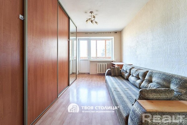 Квартира жилая, но местами нуждается в обновлении. Мебель остается по согласованию. Комната с выходом на застекленный балкон является проходной. В окнах стоят стеклопакеты, на полу лежат ламинат и плитка.