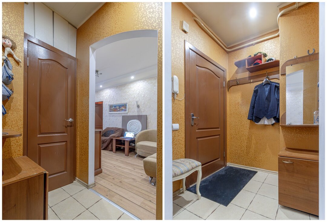 Жилье выставляется с хорошим ремонтом. Тут две отдельные комнаты. В оконных проемах стоят стеклопакеты. На полу уложены ламинат и плитка. В прихожей обустроена просторная гардеробная.