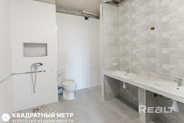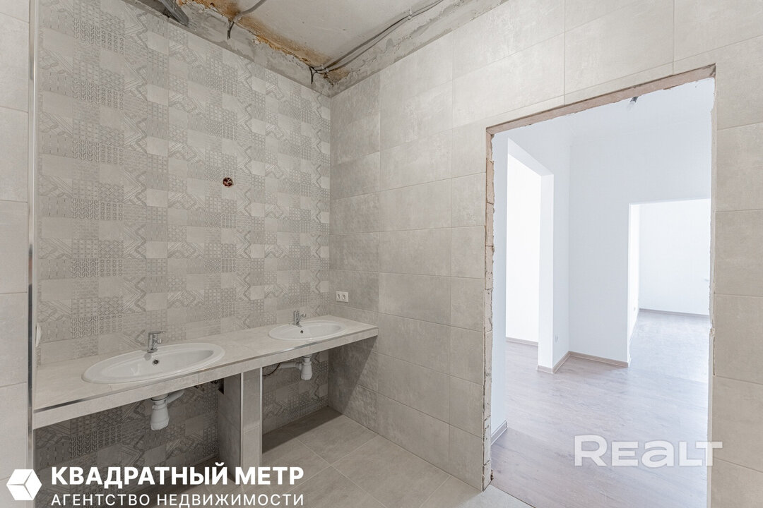 Квартира готова под чистовую отделку: разведены коммуникации, уложен пол, стены можно красить или клеить обои. В совмещенном санузле установлены два умывальника и унитаз.