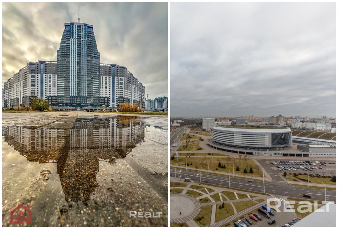 Напротив дома находится «Минск-Арена», рядом есть ТЦ, кафе и рестораны, в пешей доступности — водохранилище Дрозды.