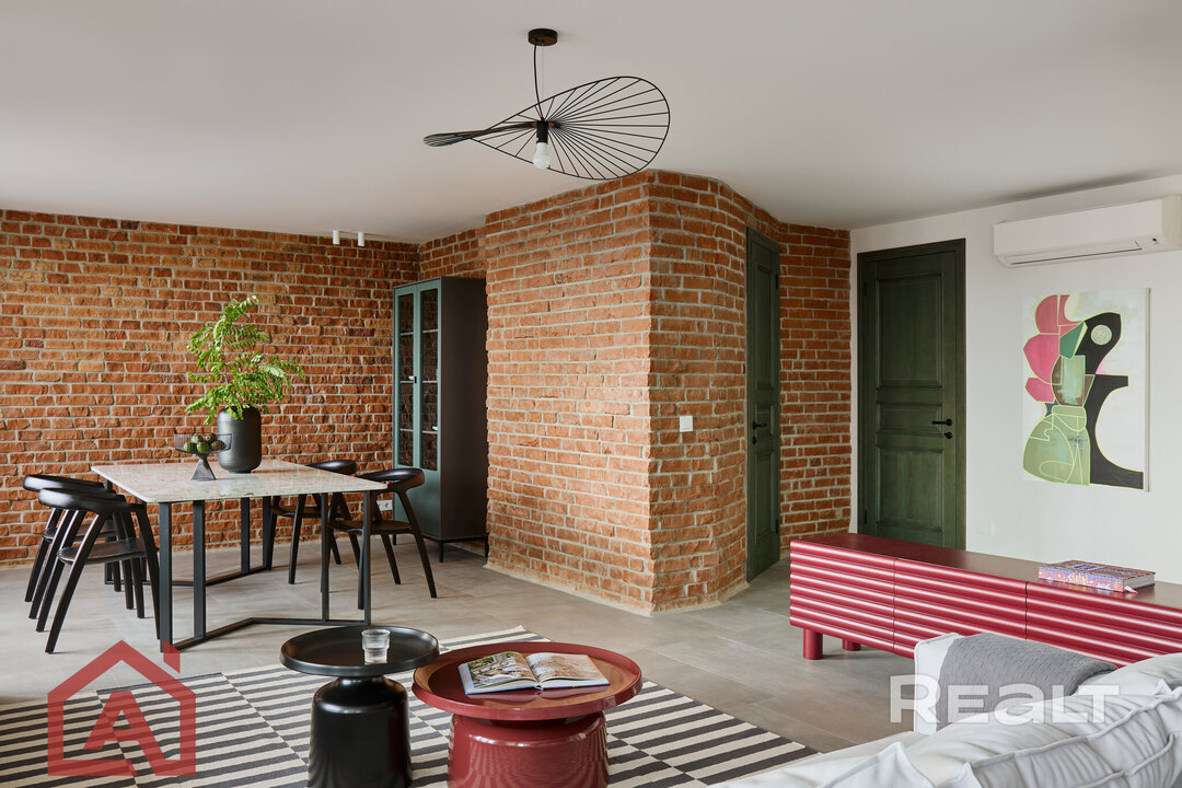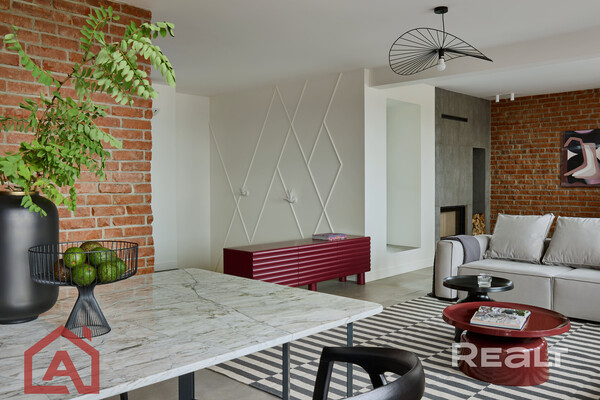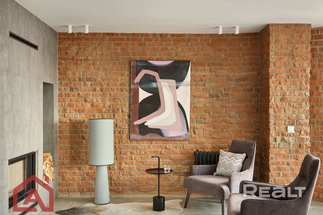 Второй уровень отделан в стиле лофт: стены украшает красный кирпич. Здесь жилое пространство представлено как open space с кухонной зоной у окна, столовой, гостиной около камина.
