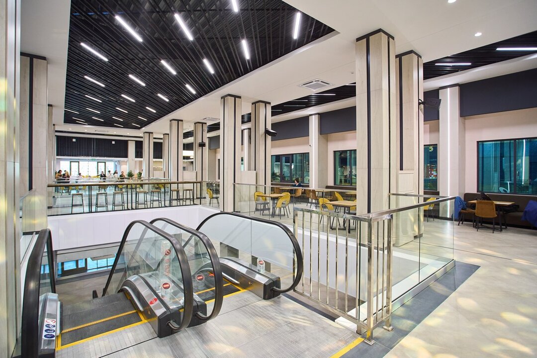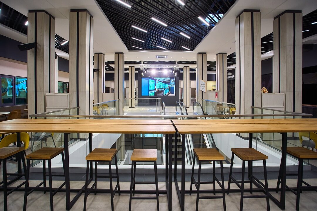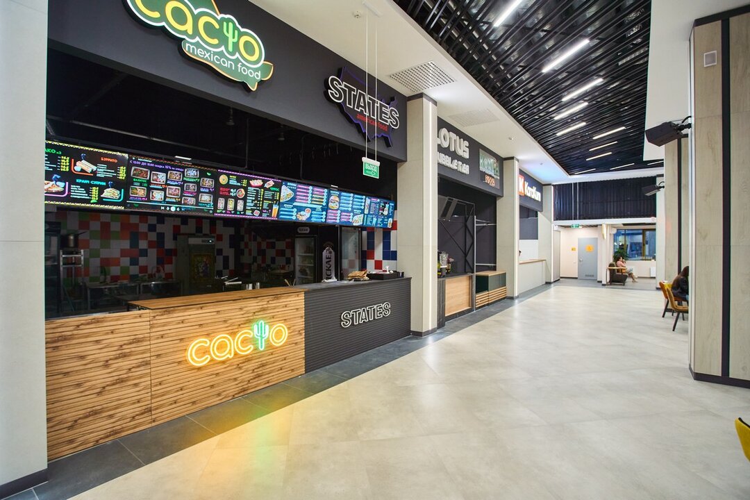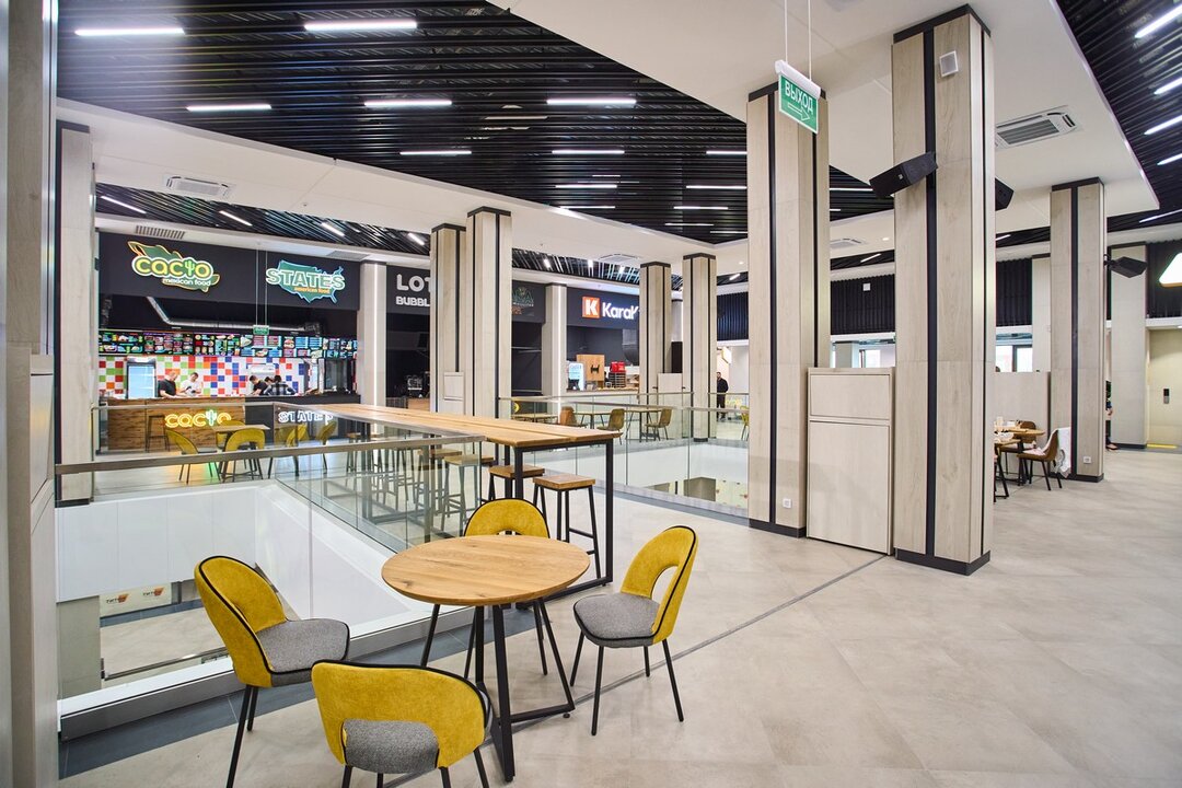 Третий этаж сделали сквозным, чтобы можно было пройти комплекс насквозь. Именно здесь откроют новый фудкорт, который объединит около десяти различных корнеров. В меню обещают большое разнообразие — от американских бургеров в States и итальянской пиццы в Koala до туркменских кебабов в KaraKum и мексиканских закусок в Cacto. Также можно будет заказать тайские супы в Pad Thai, шаурму в «Ого!», узбекский плов в Sufra и привычную домашнюю кухню в «Шеff-буфете». Всего здесь будет около 200 посадочных мест. Дополнительно установили с большой экран для трансляций.