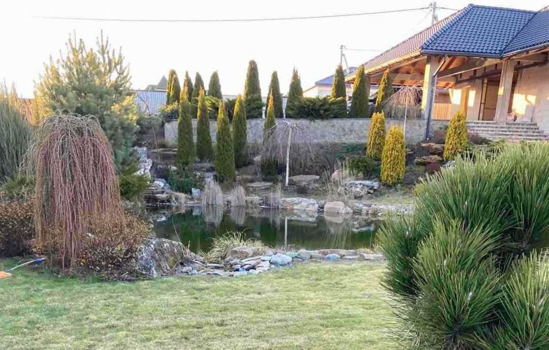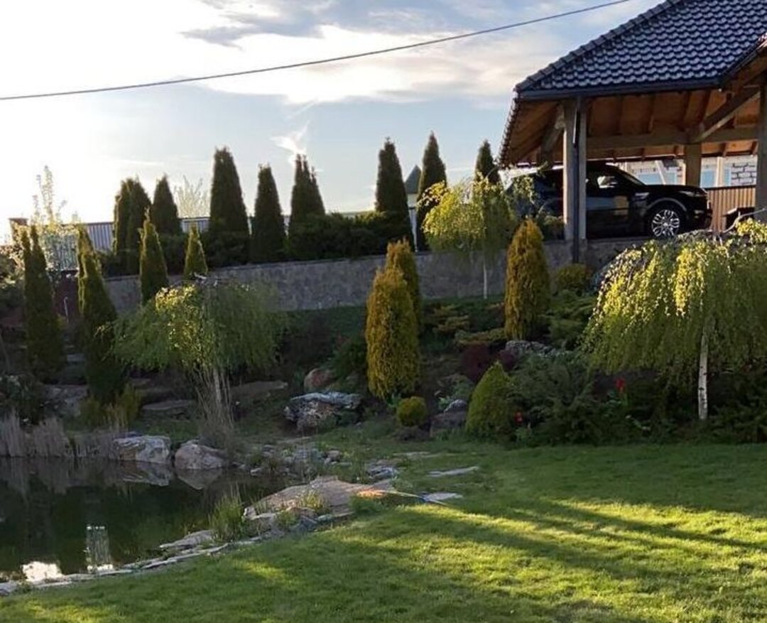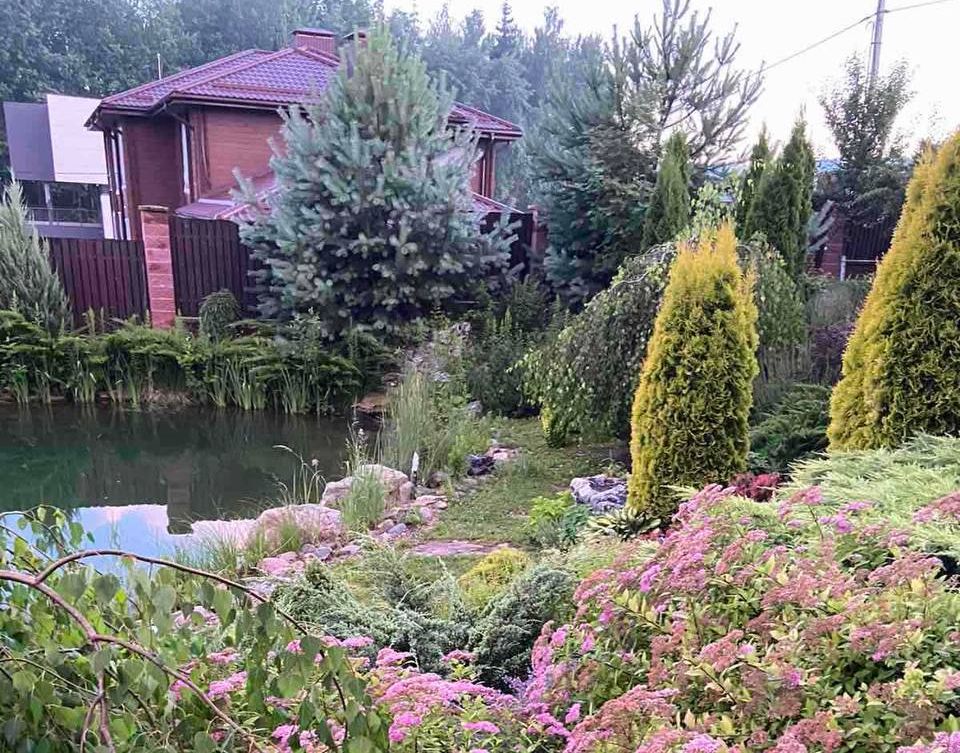 Участок в 15 соток скрыт от посторонних глаз забором. Территория благоустроена, разделена на два уровня, по которым проложены дорожки. На участке смонтирована система автополива, а с наступлением сумерек вступает в игру ландшафтное освещение. В центре ландшафтной композиции — искусственный пруд с системой фильтрации, вокруг которого высажены декоративные и плодоносящие деревья и кустарники. Есть и своя парковка, способная вместить до пяти автомобилей.