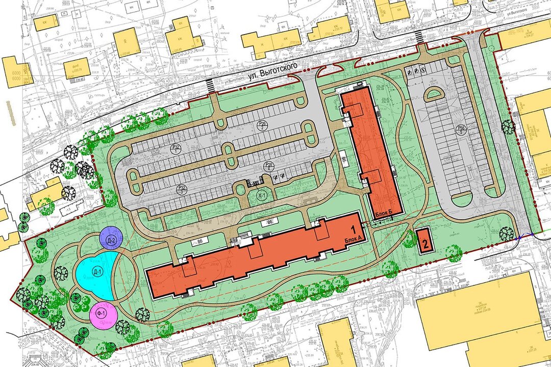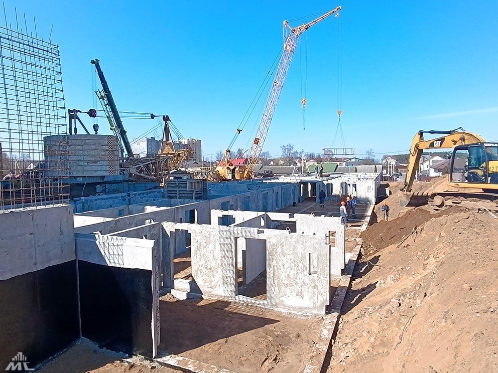 Рядом уже вырисовывается цокольный этаж блока Б. Этот корпус тоже будет десятиэтажным. Генподрядное СУ-101 уже готовит площадку под плоскостную автостоянку (а их будет две) и размечает, где благоустроит детские площадки.