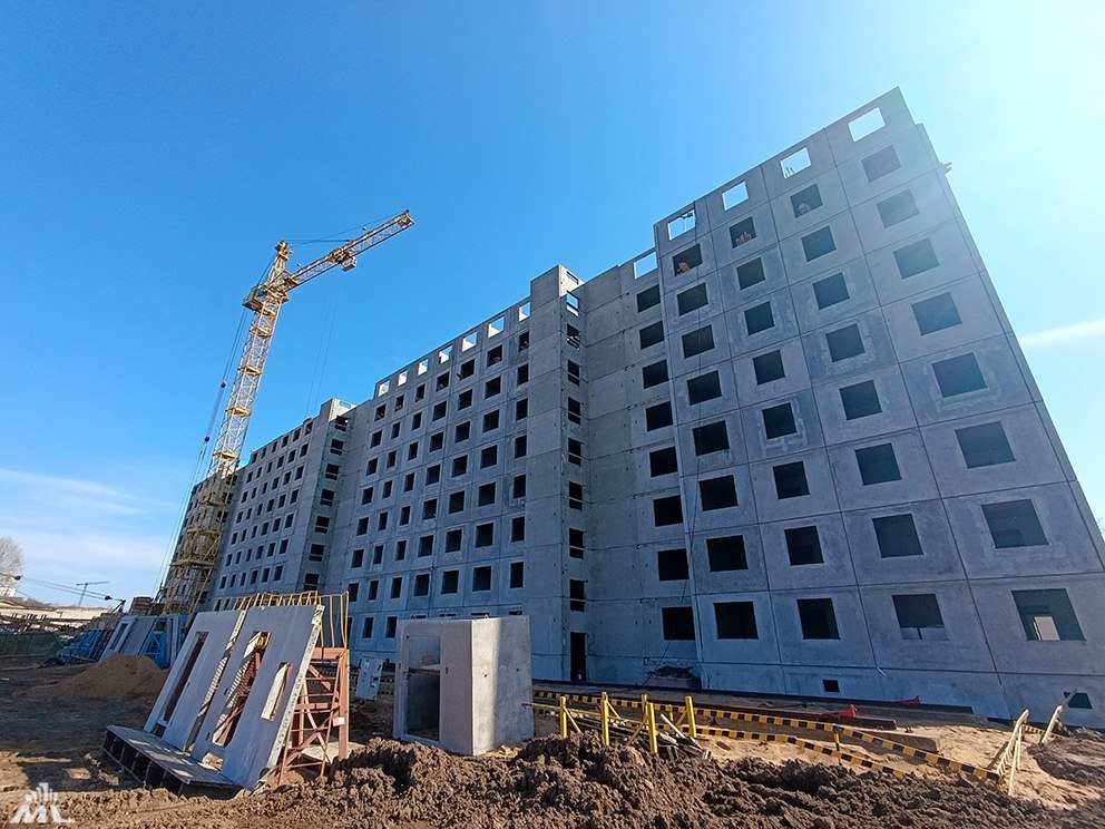 На данный момент МАПИД почти «собрал» коробку блока, А общежития, оостался последний (10-й) жилой этаж и техэтаж. Монтажники трудятся в три смены — панелевозы только успевают подвозить изделия.