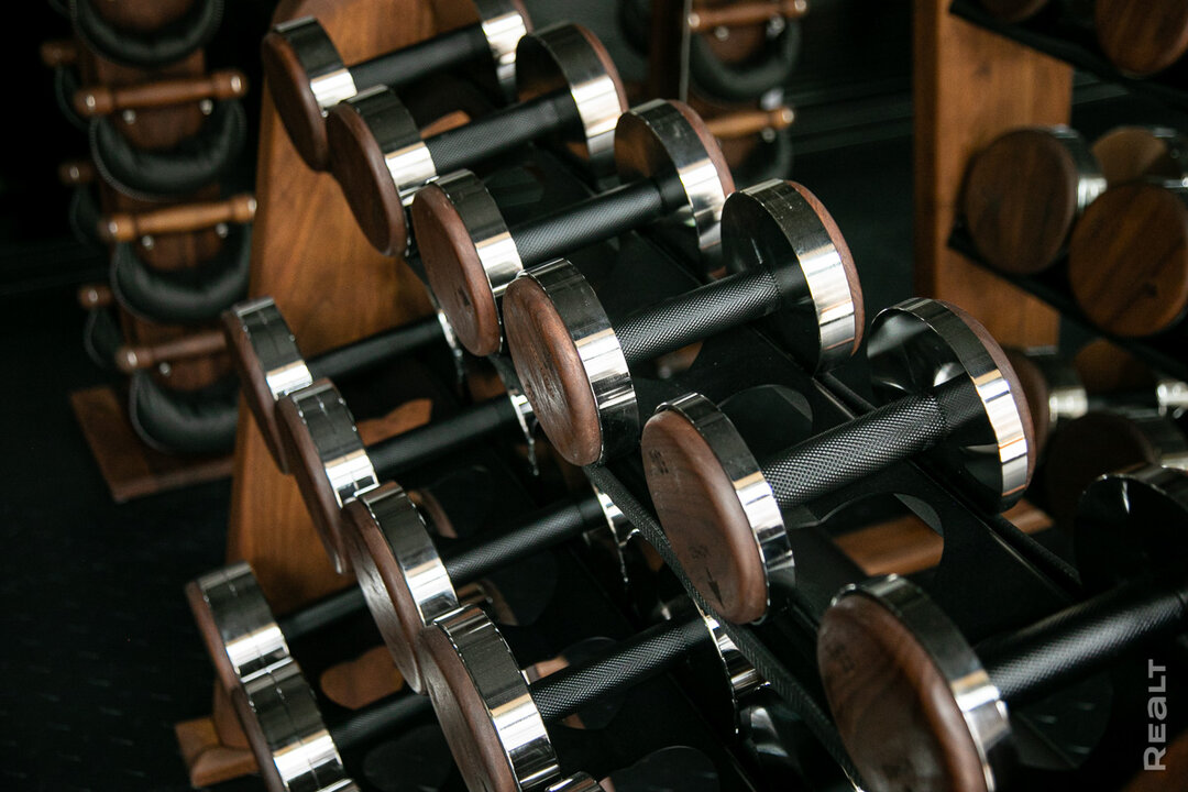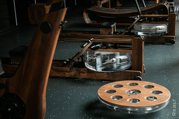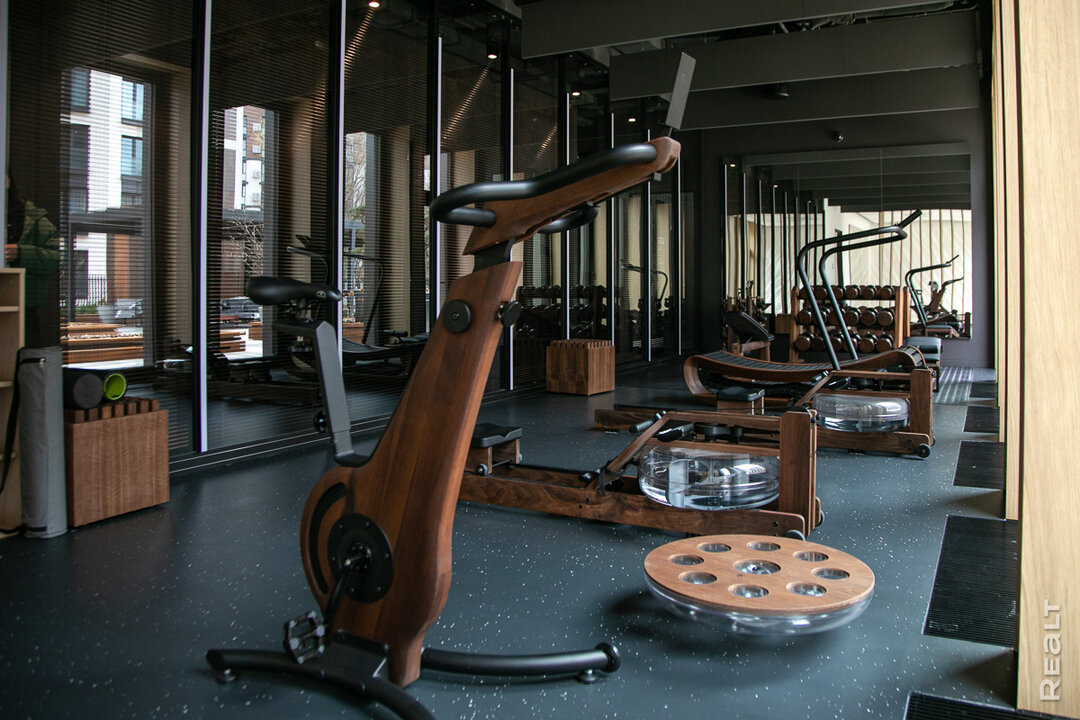 Представитель застройщика обращает наше внимание на оснащение зала. Здесь представлена фитнес-линейка деревянных тренажеров немецкого бренда NOHrD: