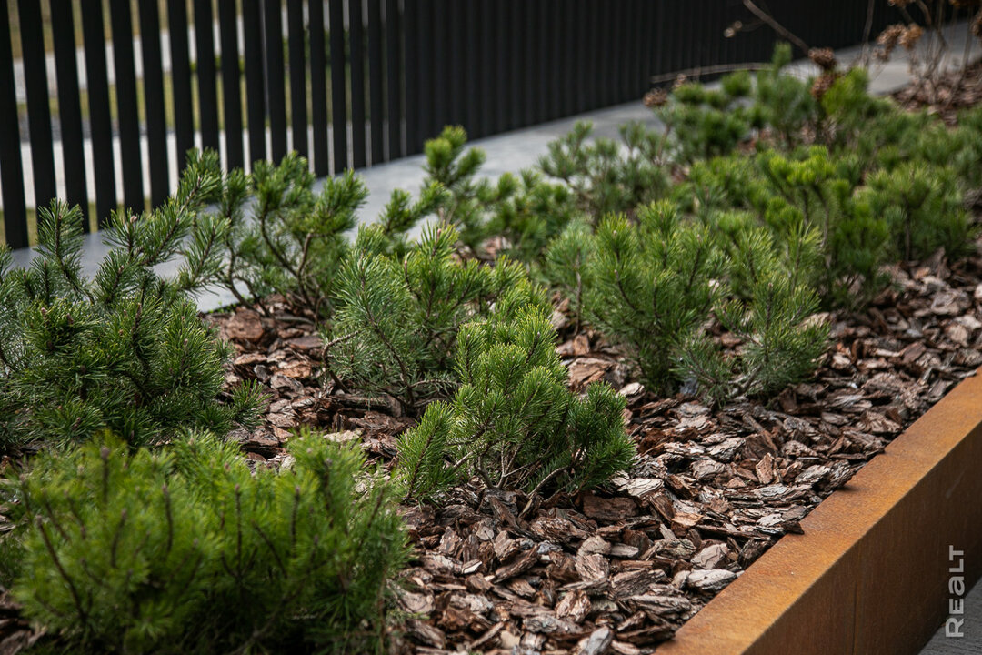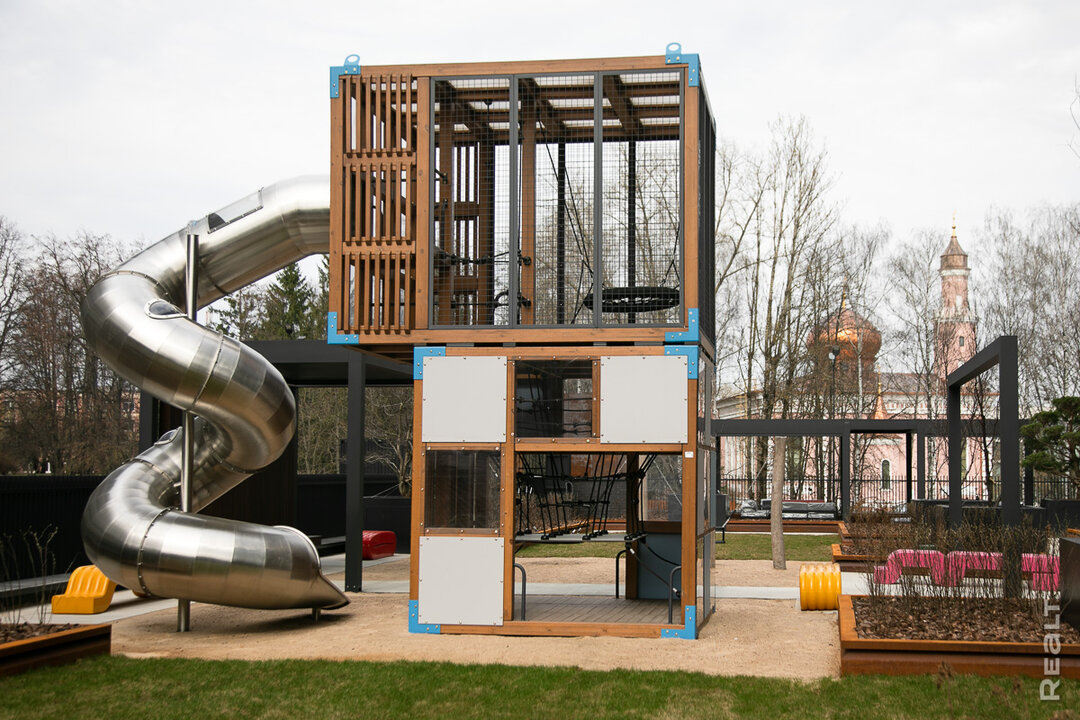Наша экскурсия по дому заканчивается в саду резидентов, расположенном на высоком закрытом стилобате. Сейчас пространство наполняется растениями: здесь уже высажены садовые бонсаи и аллея пурпурных слив. Можно посидеть с бокалом вина или с книжкой в одной из пергол либо же поиграть с детьми на детской площадке. На территории сада будет звучать спокойная лаунж-музыка, а летом тут установят системы туманообразования, которые обеспечат приятную прохладу даже в самый жаркий день.
